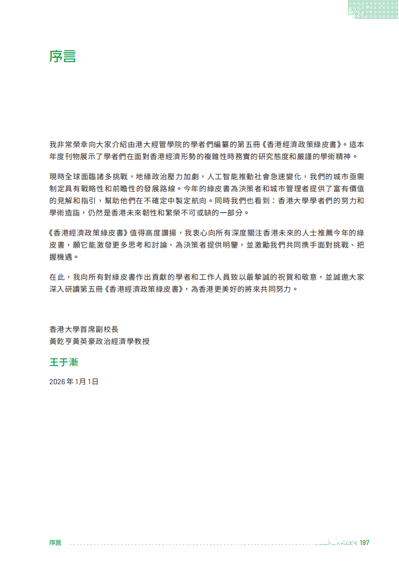 現時全球面臨諸多挑戰,地緣政治壓力加劇,人工智能推動社會急速變化,我們的城市亟需制定具有戰略性和前瞻性的發展路線。今年的綠皮書為決策者和城市管理者提供了富有價值的見解和指引,幫助他們在不確定中製定航向。同時我們也看到:香港大學學者們的努力和學術造詣,仍然是香港未來韌性和繁榮不可或缺的一部分。