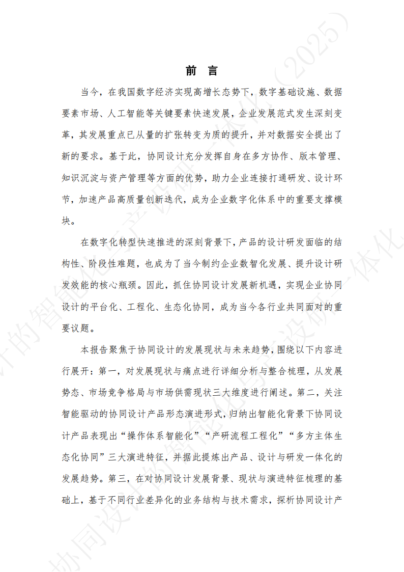 本报告聚焦于协同设计的发展现状与未来趋势,围绕以下内容进行展开:第一,对发展现状与痛点进行详细分析与整合梳理,从发展势态、市场竞争格局与市场供需现状三大维度进行阐述。第二,关注智能驱动的协同设计产品形态演进形式,归纳出智能化背景下协同设计产品表现出“操作体系智能化”“产研流程工程化”“多方主体生态化协同”三大演进特征,并据此提炼出产品、设计与研发一体化的发展趋势。第三,在对协同设计发展背景、现状与演进特征梳理的基础上,基于不同行业差异化的业务结构与技术需求,探析协同设计产品的行业新机遇。第四,在对协同设计领域深度调研后,从应用深度与广度出发,系统梳理并提炼了具有代表性的协同设计典型场景,并进一步遴选出若干在相关场景中表现突出的先进企业案例,结合其在数字化转型中的优秀实践与行业示范价值,展开深入分析与探讨。最后,将人工智能赋能背景下协同设计产品未来发展趋势提炼整合为“全链路智能化管理:实现设计研发流程的系统性重构”“协同范式演进:迈向以人为中心的多智能体协作体系”“本土化协同生态融合:内生适配到国际化标准输出”三个维度。