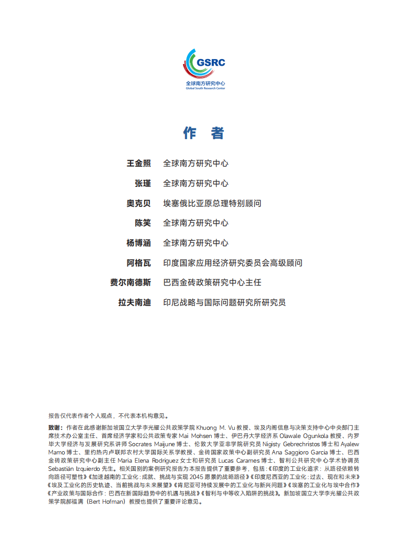 致谢:作者在此感谢新加坡国立大学李光耀公共政策学院 Khuong M. Vu教授、埃及内阁信息与决策支持中心中央部门主席技术办公室主任、首席经济学家和公共政策专家Mai Mohsen博士、伊巴丹大学经济系Olawale Ogunkola教授、内罗毕大学经济与发展研究系讲师Socrates Maijune博士、伦敦大学亚非学院研究员Nigisty Gebrechristos博士和 AyalewMamo博士、里约热内卢联邦农村大学国际关系学教授、金砖国家政策中心副研究员Ana Saggioro Garcia博士、巴西金砖政策研究中心副主任Maria Elena Rodriguez女士和研究员Lucas Carames博士、智利公共研究中心学术协调员Sebastián lzquierdo 先生。相关国别的案例研究报告为本报告提供了重要参考,包括:《印度的工业化追求:从路径依赖转向路径可塑性》《加速越南的工业化:成就、挑战与实现2045愿景的战略路径》《印度尼西亚的工业化:过去、现在和未来》《埃及工业化的历史轨迹、当前挑战与未来展望》《肯尼亚可持续发展中的工业化与新兴问题》《埃塞的工业化与埃中合作》《产业政策与国际合作:巴西在新国际趋势中的机遇与挑战》《智利与中等收入陷阱的挑战》。新加坡国立大学李光耀公共政策学院郝福满(Bert Hofman)教授也提供了重要评论意见。