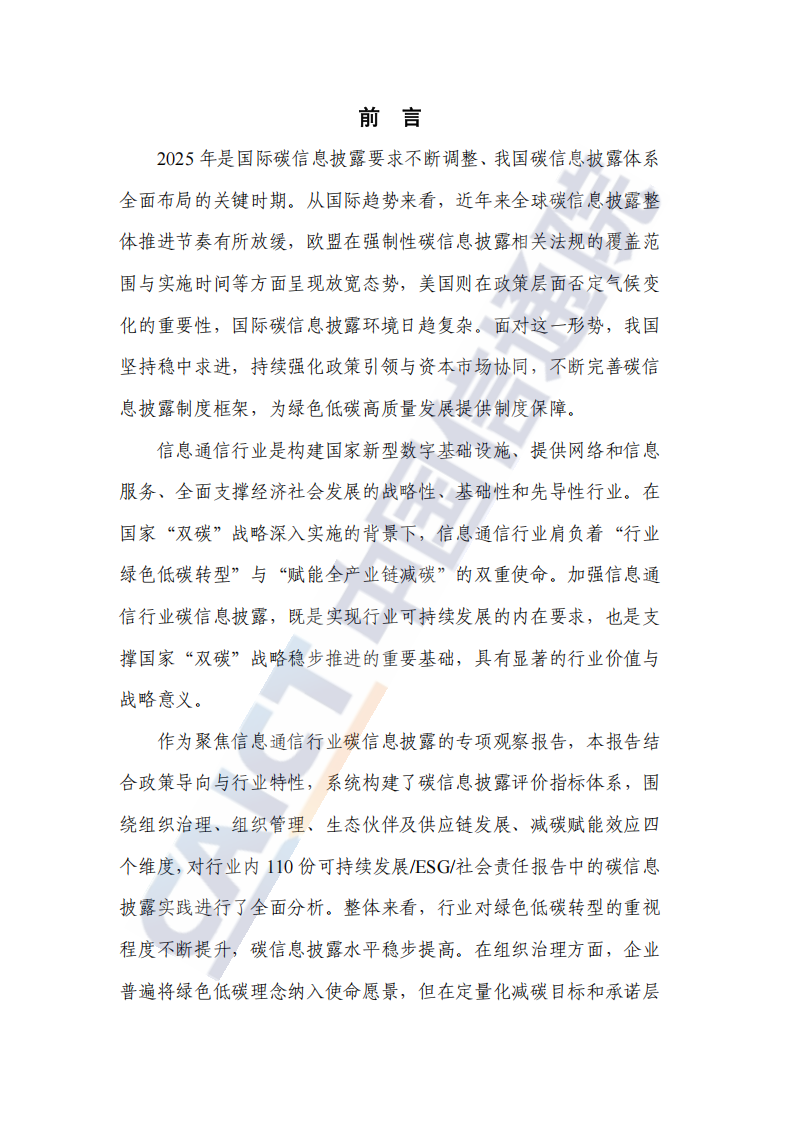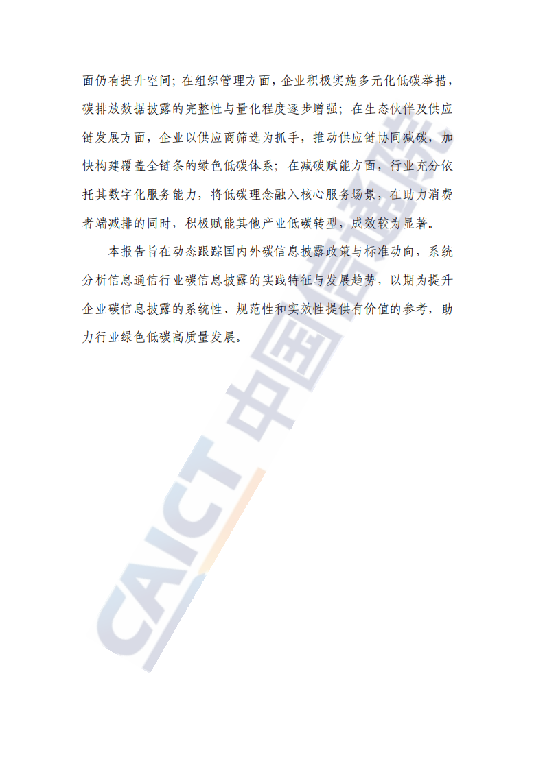 本报告旨在动态跟踪国内外碳信息披露政策与标准动向,系统分析信息通信行业碳信息披露的实践特征与发展趋势,以期为提升企业碳信息披露的系统性、规范性和实效性提供有价值的参考,助力行业绿色低碳高质量发展。