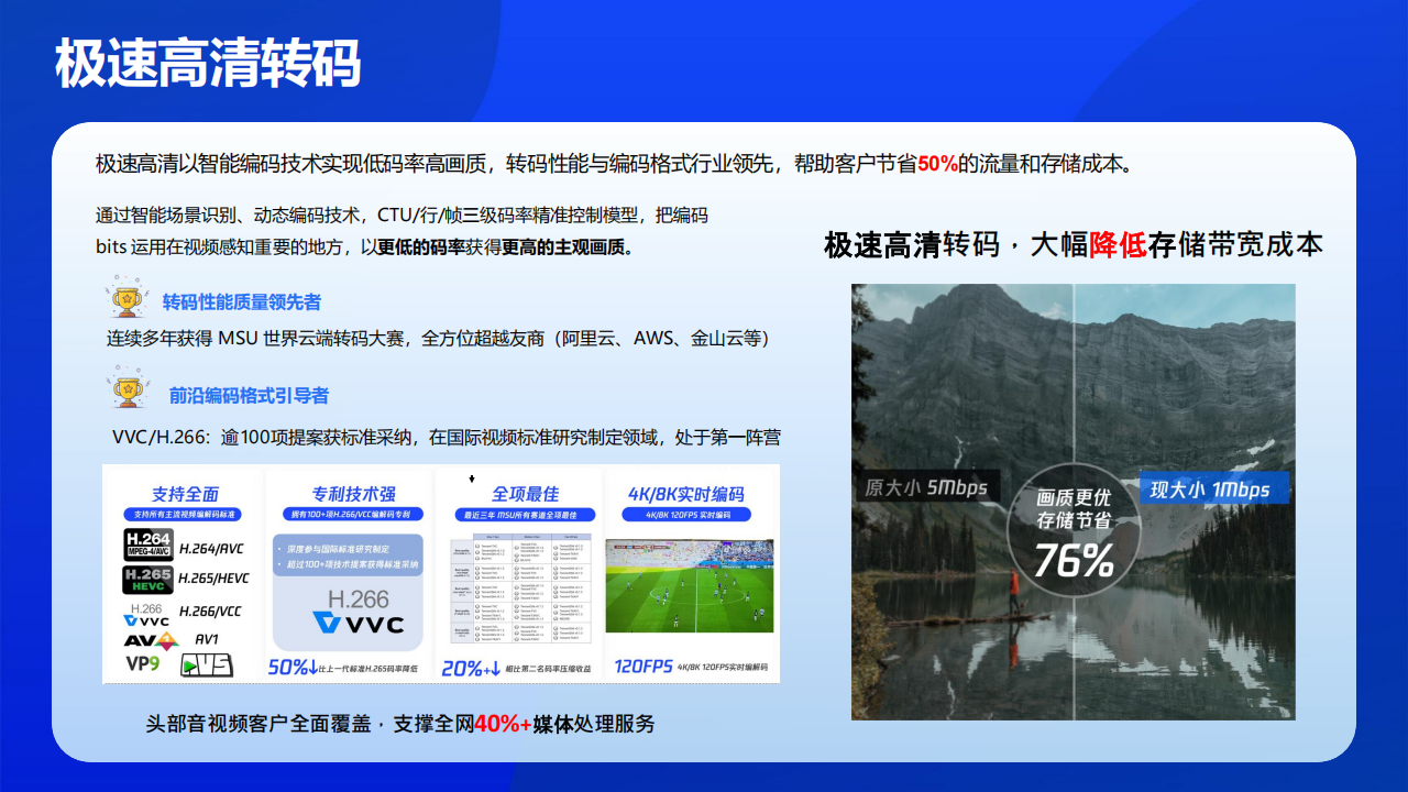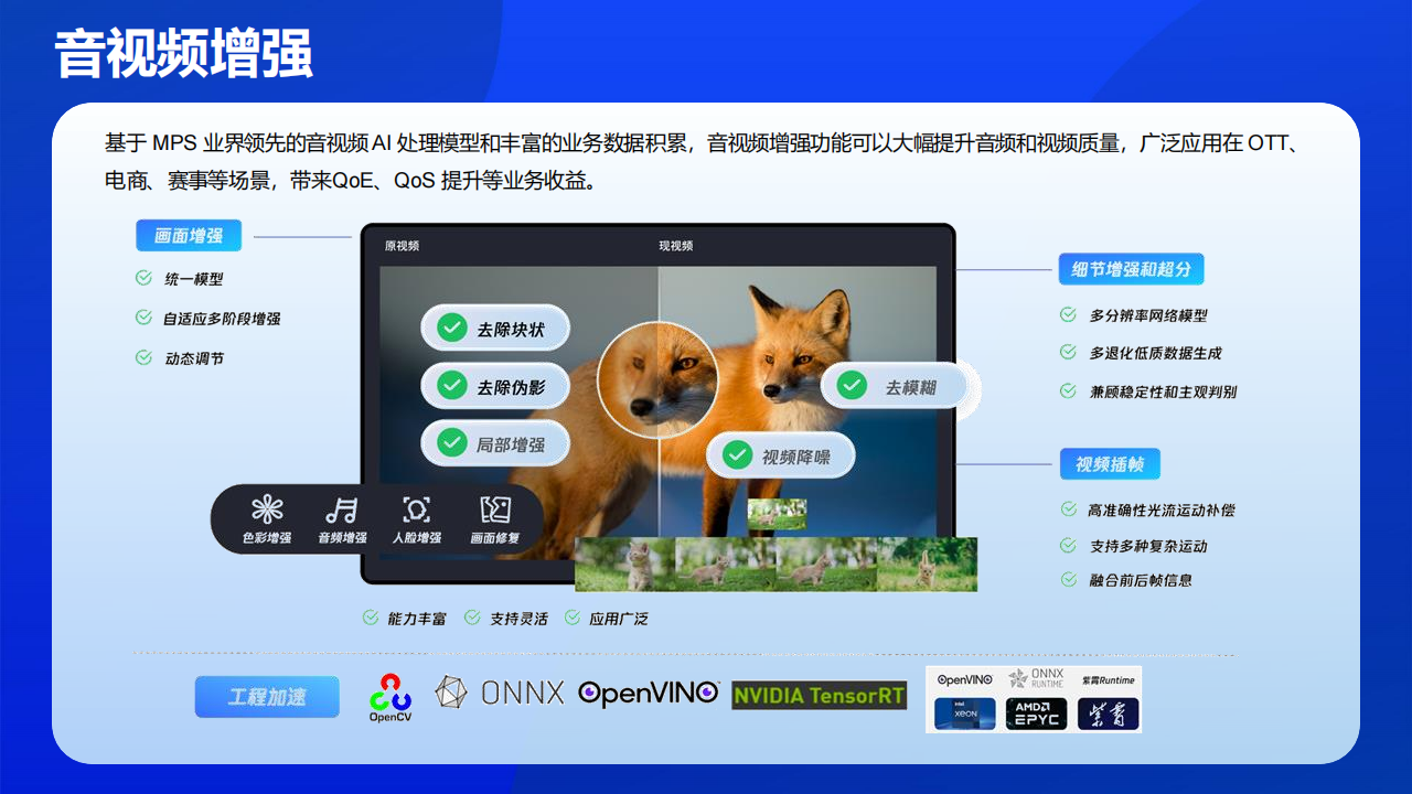 音视频增强、内容理解、内容审核、云端原生录制、互动应用直播、云端特效宣染等能力,支持公有云及专有云方式灵活部署,可满足客
