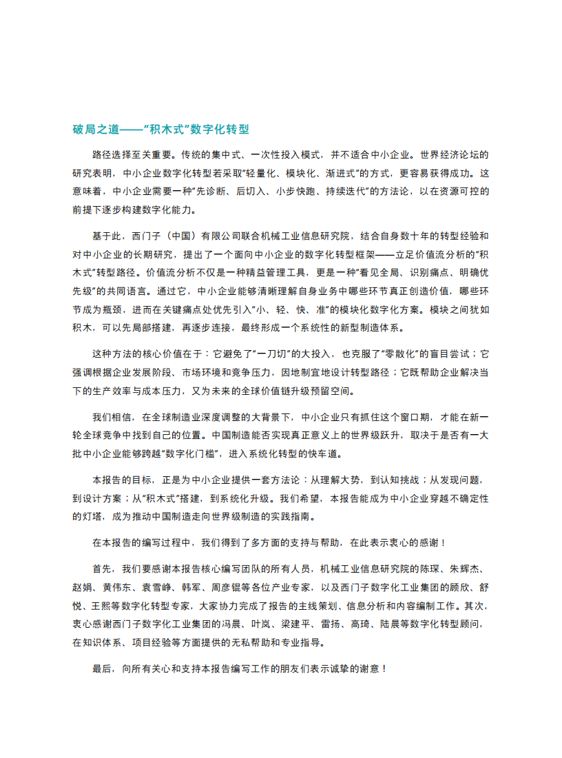 首先,我们要感谢本报告核心编写团队的所有人员,机械工业信息研究院的陈琛、朱辉杰、赵娟、黄伟东、袁雪峥、韩军、周彦锟等各位产业专家,以及西门子数字化工业集团的顾欣、舒悦、王熙等数字化转型专家,大家协力完成了报告的主线策划、信息分析和内容编制工作。其次,衷心感谢西门子数字化工业集团的冯晨、叶岚、梁建平、雷扬、高琦、陆晨等数字化转型顾问,在知识体系、项目经验等方面提供的无私帮助和专业指导。