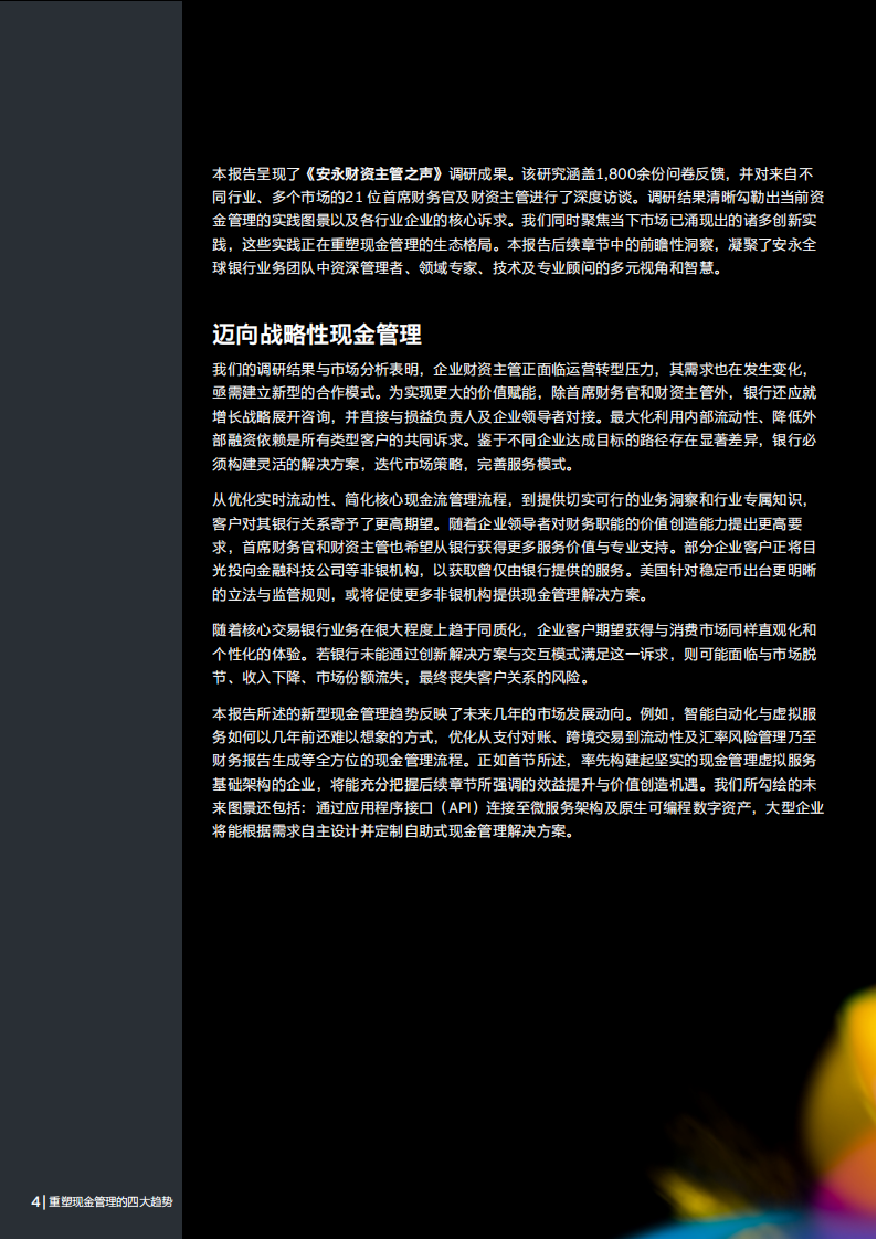 现金管理正加速从交易型产品向战略性、数据驱动型服务演进,这一转型既需要深厚的专业知识,也离不开智能工具与集成化数据流。业界正在基于人工智能(AI)与机器学习(ML)构建先进解决方案,并积极布局稳定币和通证化基金等数字资产领域。来自不同行业及不同规模企业的首席财务官、财资主管及其他财务高管已充分认识到,自动化数字解决方案和更丰富的数据集正在开创前所未有的可能性。完成前瞻性布局,部署最前沿技术,能为深化创新和转型奠定基础,将财务团队重塑为企业的战略顾问。本报告呈现了《安永财资主管之声》调研成果。该研究涵盖1,800余份问卷反馈,并对来自不同行业、多个市场的21位首席财务官及财资主管进行了深度访谈。调研结果清晰勾勒出当前资金管理的实践图景以及各行业企业的核心诉求。我们同时聚焦当下市场已涌现出的诸多创新实践,这些实践正在重塑现金管理的生态格局。本报告后续章节中的前瞻性洞察,凝聚了安永全球银行业务团队中资深管理者、领域专家、技术及专业顾问的多元视角和智慧。