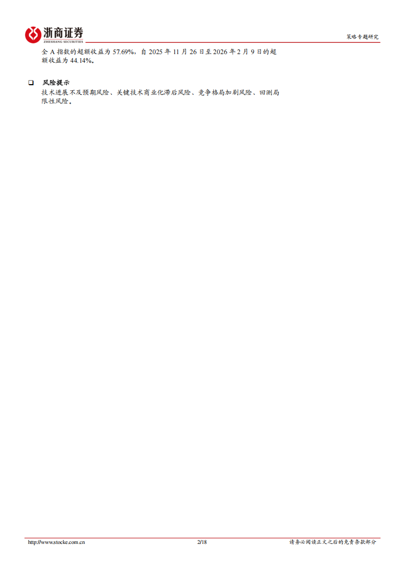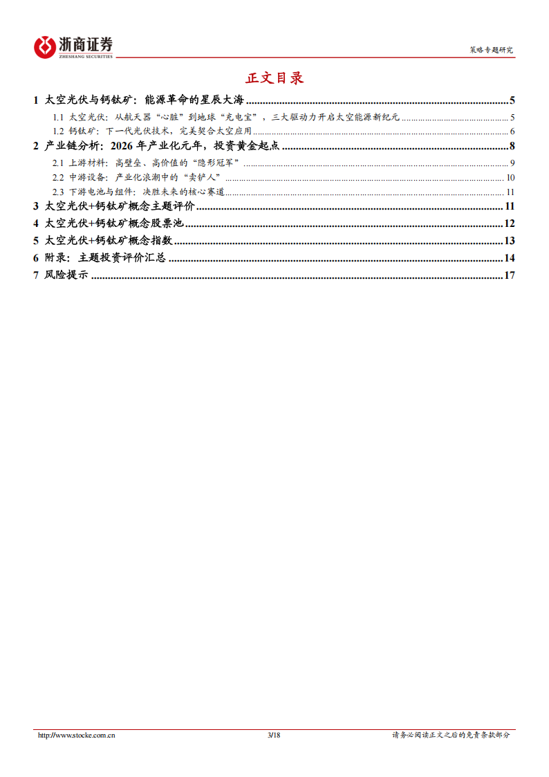 我们从市值容量、政策有效性、政策支持力度、行业覆盖面、估值水平、交易拥挤度、业绩兑现能力、未来想象空间,这8大维度对投资主题进行评分,太空光伏+钙钛矿概念主题的得分为85分,其中政策有效性、政策支持力度、交易拥挤程度这三项指标得分较高。我们从材料、设备、电池与组件这3个环节,选取42个相关受益标的组成太空光伏+钙钛矿概念股票池,并按自由流通市值加权后编制太空光伏+钙钛矿概念指数,回测2025年初至2026年2月9日相较Wind全A指数的超额收益为57.69%,自2025年11月26日至2026年2月9日的超额收益为44.14%。