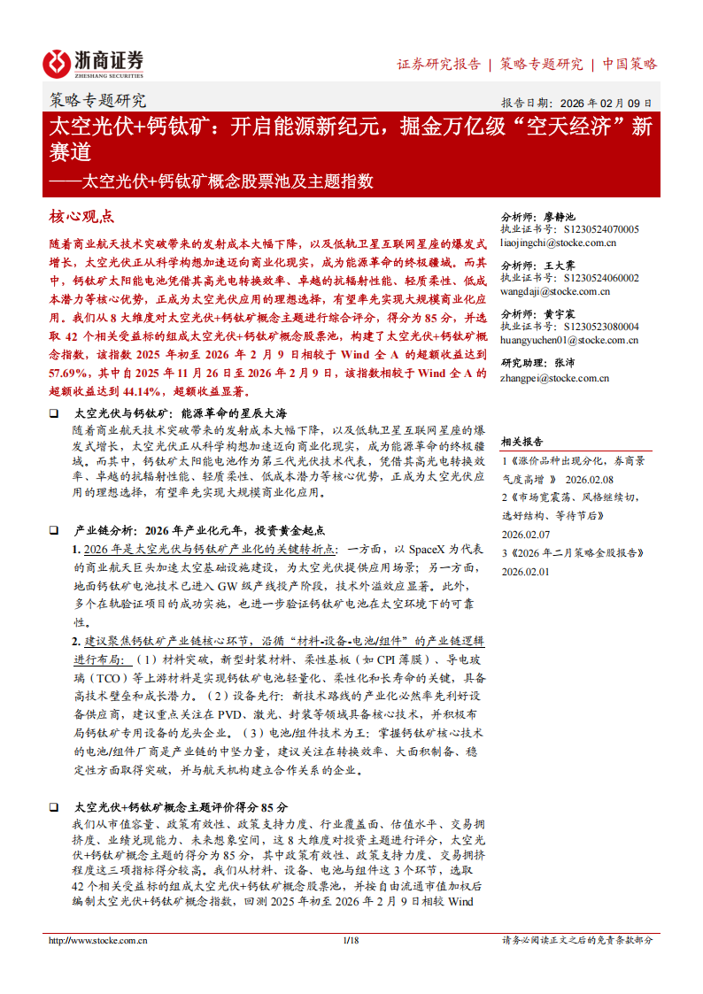 随着商业航天技术突破带来的发射成本大幅下降,以及低轨卫星互联网星座的爆发式增长,太空光伏正从科学构想加速迈向商业化现实,成为能源革命的终极疆域。而其中,钙钛矿太阳能电池凭借其高光电转换效率、卓越的抗辐射性能、轻质柔性、低成本潜力等核心优势,正成为太空光伏应用的理想选择,有望率先实现大规模商业化应用。我们从8大维度对太空光伏+钙钛矿概念主题进行综合评分,得分为85分,并选取42个相关受益标的组成太空光伏+钙钛矿概念股票池,构建了太空光伏+钙钛矿概念指数,该指数2025年初至2026年2月9日相较于Wind全A的超额收益达到57.69%,其中自2025年11月26日至2026年2月9日,该指数相较于Wind全A的超额收益达到44.14%,超额收益显著。