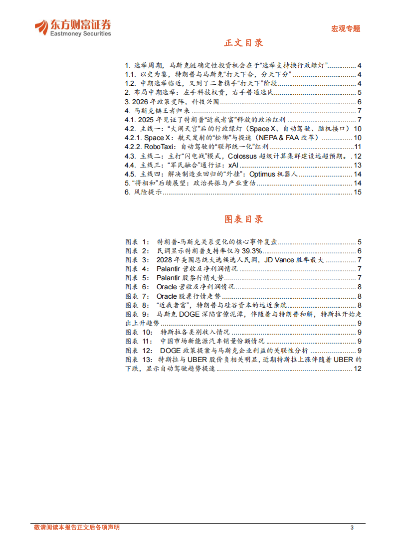 2026年特朗普与马斯克“将相和”,马斯克链确定性投资机会在于“选举支持换行政绿灯”与“国家战略绑定”双重逻辑。以史为鉴,特朗普与马斯克“打天下”合,“分天下”分;中期选举临近,又到了二者携手“打天下”阶段——特朗普民调支持率越低,马斯克行政权力越大。
