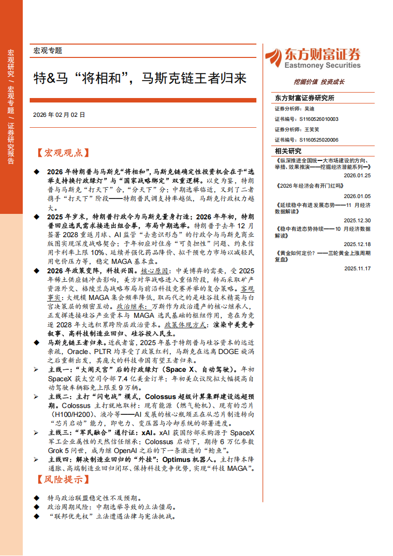 2025年岁末,特朗普行政令为马斯克量身打造;2026年年初,特朗普回应选民需求接连出组合拳,布局中期选举。特朗普于去年12月签署2028重返月球、AI监管“去意识形态”的行政令与马斯克商业版图实现深度战略契合;于年初应对住房“可负担性”问题、约束信用卡利率上限10%、延续并强化药品降价、拟干预电力市场以减轻民用电价压力等,稳定MAGA基本盘。