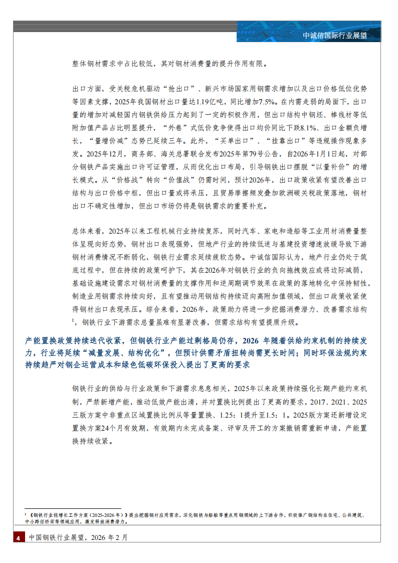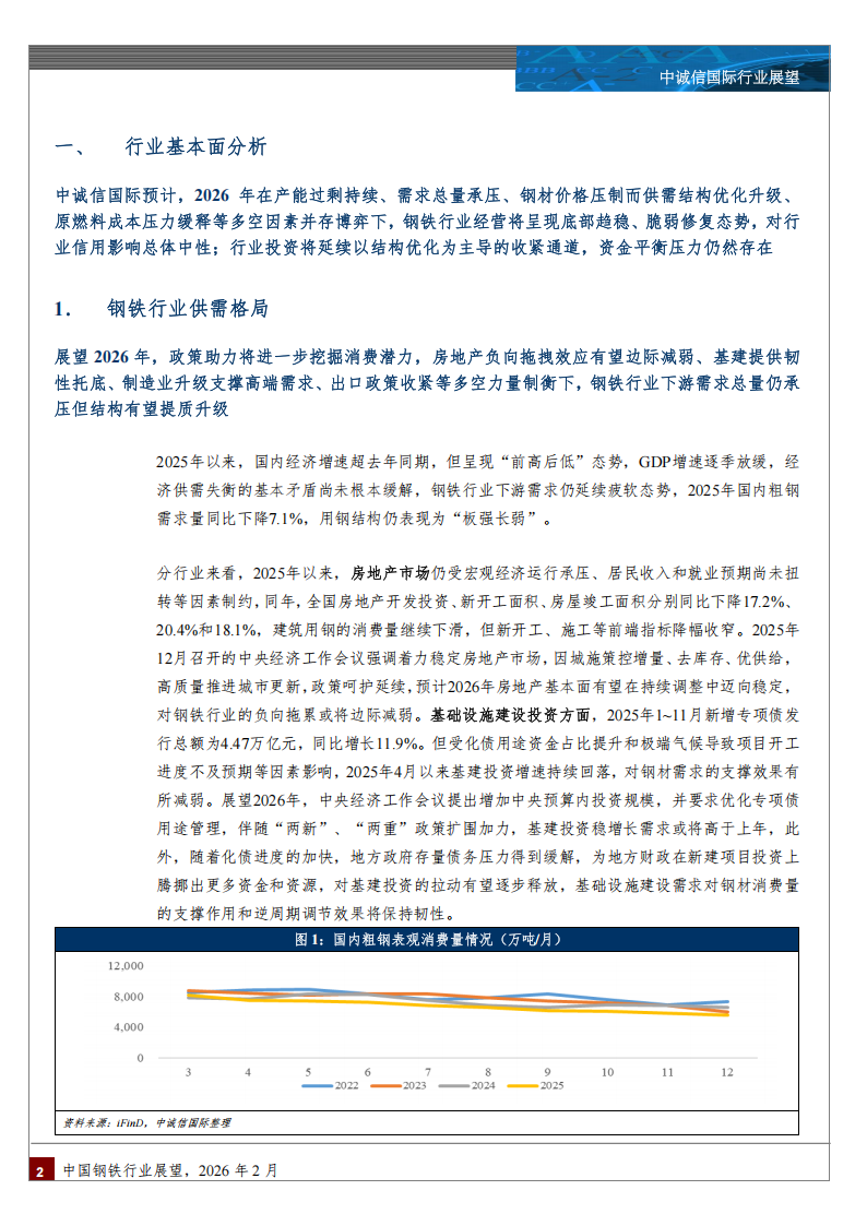 总体来看,2025年以来工程机械行业持续复苏,同时汽车、家电和造船等工业用材消费量整体呈现向好态势,钢材出口表现强势,但地产行业的持续低迷与基建投资增速放缓导致下游钢材消费情况不断弱化,钢铁行业需求延续疲软态势。中诚信国际认为,地产行业仍处于筑底过程中,但在持续的政策呵护下,其在2026年对钢铁行业的负向拖拽效应或将边际减弱,基础设施建设需求对钢材消费量的支撑作用和逆周期调节效果在政策的落地转化中保持韧性,制造业用钢需求持续向好,且有望推动用钢结构持续迈向高附加值领域,但出口政策收紧使得钢材出口表现承压。综合来看,2026年,政策助力将进一步挖掘消费潜力、改善需求结构1,钢铁行业下游需求总量虽难有显著改善,但需求结构有望提质升级。