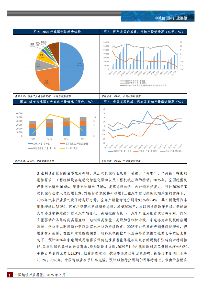 分行业来看,2025年以来,房地产市场仍受宏观经济运行承压、居民收入和就业预期尚未扭转等因素制约,同年,全国房地产开发投资、新开工面积、房屋竣工面积分别同比下降17.2%、20.4%和18.1%,建筑用钢的消费量继续下滑,但新开工、施工等前端指标降幅收窄。2025年12月召开的中央经济工作会议强调着力稳定房地产市场,因城施策控增量、去库存、优供给,高质量推进城市更新,政策呵护延续,预计2026年房地产基本面有望在持续调整中迈向稳定,对钢铁行业的负向拖累或将边际减弱。基础设施建设投资方面,2025年1~11月新增专项债发行总额为4.47万亿元,同比增长11.9%。但受化债用途资金占比提升和极端气候导致项目开工进度不及预期等因素影响,2025年4月以来基建投资增速持续回落,对钢材需求的支撑效果有所减弱。展望2026年,中央经济工作会议提出增加中央预算内投资规模,并要求优化专项债用途管理,伴随“两新”、“两重”政策扩围加力,基建投资稳增长需求或将高于上年,此外,随着化债进度的加快,地方政府存量债务压力得到缓解,为地方财政在新建项目投资上腾挪出更多资金和资源,对基建投资的拉动有望逐步释放,基础设施建设需求对钢材消费量的支撑作用和逆周期调节效果将保持韧性。工业制造是板材的主要应用领域。从工程机械行业来看,受益于“两重”、“两新”带来的刚性需求、工程机械设备电动化智能化驱动以及工程机械出海的拉动,2025年,全国挖掘机产量同比增长16.6%、销量同比增长17.0%,复苏态势加快,内外销同步发力,预计2026年工程机械行业进入理性增长期,对钢材需求保持平稳增长。在汽车以旧换新长期政策的支持下,2025年汽车行业景气度保持良好态势,全年产销量增速分别为9.8%和9.4%,其中新能源汽车销量增速达28.2%,汽车用钢需求延续增长态势。展望2026年,在以旧换新政策延续、新能源汽车渗透率持续提升以及汽车轻量化、高端化的背景下,汽车产业用钢需求仍将可观,同时有望驱动产品结构向高强度钢、硅钢等高性能、高附加值钢材升级。家电亦为冷轧板的应用领域,受益于以旧换新补贴以及家电出口的持续改善,2025年白色家电产销量保持增长,但增速有所放缓。在国补政策效应减弱、智能家电的推广以及海外需求恢复性增长多重因素影响下,预计2026年家电领域用钢需求保持韧性且着重体现在从过去的规模扩张转向对材料性能、品质和绿色属性的升级需求。船舶制造业方面,2025年1~9月我国造船完工量同比增长6.0%,手持订单量同比增长25.3%,但受地缘政治、航运市场波动等因素影响,新接订单量同比下降23.5%。2026年,中国造船业在手订单充裕,预计船舶行业用钢仍可维持增长,但由于船板在整体钢材需求中占比较低,其对钢材消费量的提升作用有限。