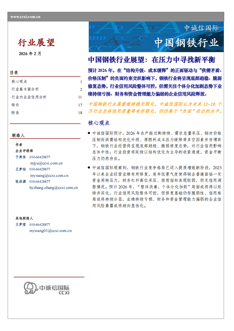 中诚信国际预计,2026年在产能过剩持续、需求总量承压、钢材价格压制而供需结构优化升级、原燃料成本压力缓释等多空因素并存博弈下,钢铁行业经营将呈现底部趋稳、脆弱修复态势,对行业信用影响总体中性;行业投资将延续以结构优化为主导的收紧通道,资金平衡压力仍然存在
