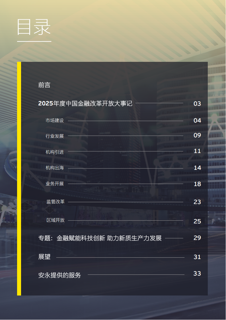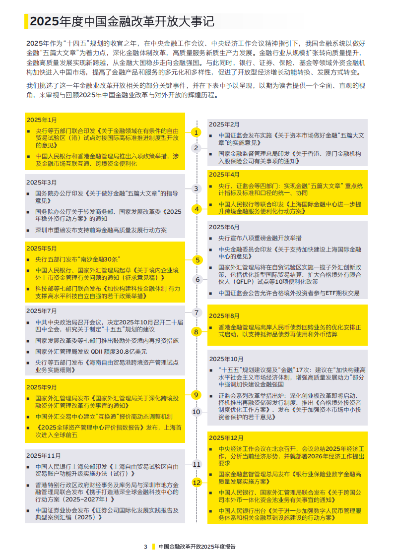 2025年作为“十四五”规划的收官之年,在中央金融工作会议、中央经济工作会议精神指引下,我国金融系统以做好金融“五篇大文章”为着力点,深化金融体制改革,高质量服务新质生产力发展。金融行业从规模扩张转向质量提升,金融高质量发展实现新跨越,从金融大国稳步走向金融强国。与此同时,银行、证券、保险、基金等领域外资金融机构加快进入中国市场,提高了金融产品和服务的多元化和多样性,促进了开放型经济增长动能转换、发展方式转变。我们挑选了这一年金融业改革开放相关的部分关键事件,并在下表中予以呈现,以期为读者提供一个全面、直观的视角,来审视与回顾2025年中国金融业改革与对外开放的辉煌历程。