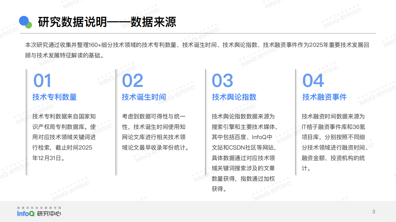 本次研究通过收集并整理160+细分技术领域的技术专利数量、技术诞生时间、技术舆论指数、技术融资事件作为2025年重要技术发展回