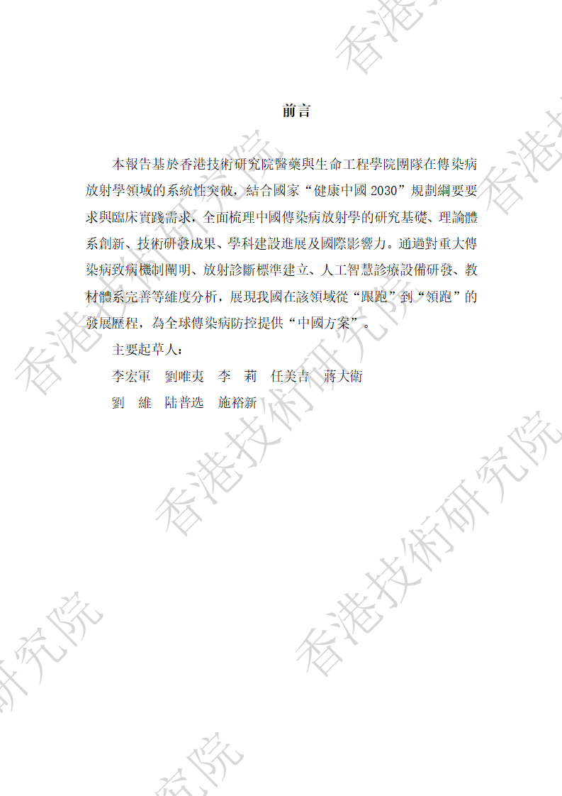 本報告基於香港技術研究院醫藥與生命工程學院團隊在傳染病放射學领域的系統性突破,結合國家“健康中國2030”規劃綱要要求與臨床實踐需求,全面梳理中國傳染病放射學的研究基礎、理論體系創新、技術研發成果、學科建設進展及國際影響力。通過對重大傳染病致病機制聞明、放射診断標準建立、人工智慧診療設備研發、教材體系完善等維度分析,展現我國在該领域從“跟跑”到“领跑”的發展歷程,為全球傳染病防控提供“中國方案”。