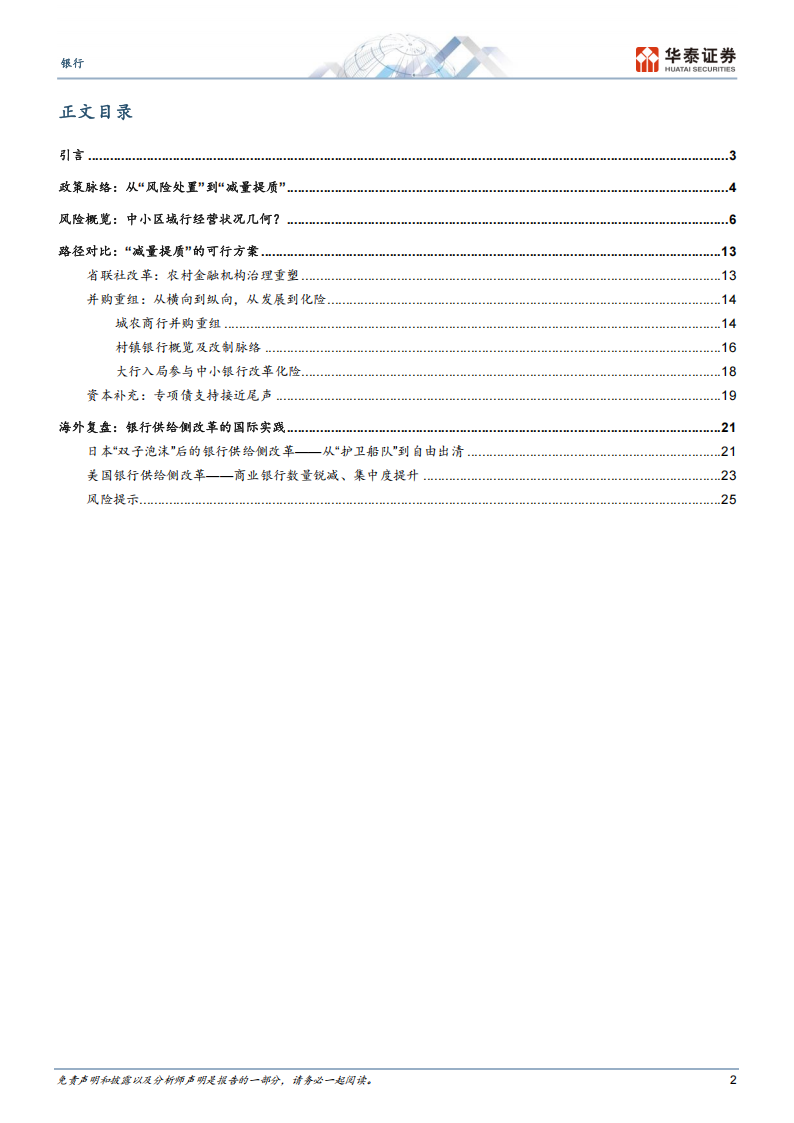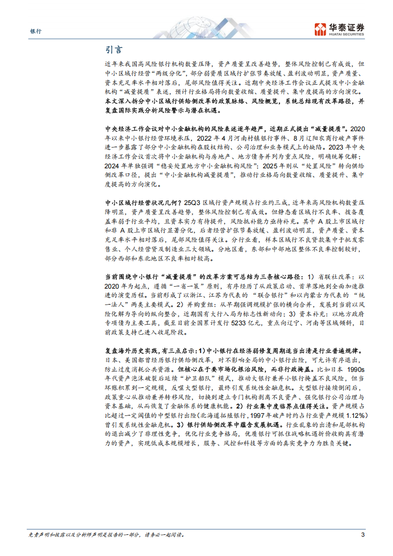 近年来我国高风险银行机构数量压降,资产质量呈改善趋势,整体风险控制已有成效,但中小区域行经营“两级分化”,部分弱资质区域行扩张节奏放缓、盈利波动明显,资产质量、资本充足率水平相对落后,尾部风险值得关注。近期中央经济工作会议正式提及中小金融机构“减量提质”,预计行业格局将向数量收缩、质量提升、集中度提高的方向演化。本文深入拆分中小区域行供给侧改革的政策脉络、风险概览,系统总结现有改革路径,并复盘国际实践分析风险警示与潜在机遇。