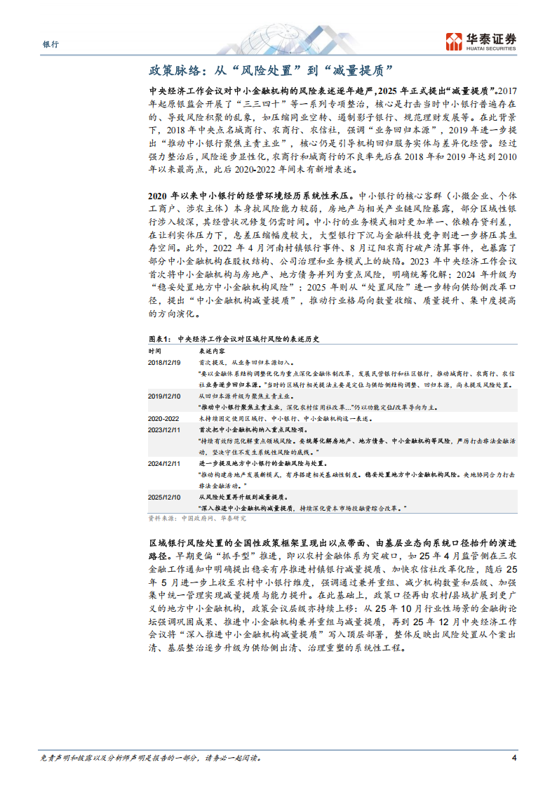中央经济工作会议对中小金融机构的风险表述逐年趋严,2025年底正式提出“减量提质”。2020年以来中小银行经营环境承压,2022年4月河南村镇银行事件、8月辽阳农商行破产事件进一步暴露了部分中小金融机构在股权结构、公司治理和业务模式上的缺陷。2023年中央经济工作会议首次将中小金融机构与房地产、地方债务并列为重点风险,明确统筹化解;2024年单独强调“稳妥处置地方中小金融机构风险”;2025年则从“处置风险”转向供给侧改革口径,提出“中小金融机构减量提质”,推动行业格局向数量收缩、质量提升、集中度提高的方向演化。