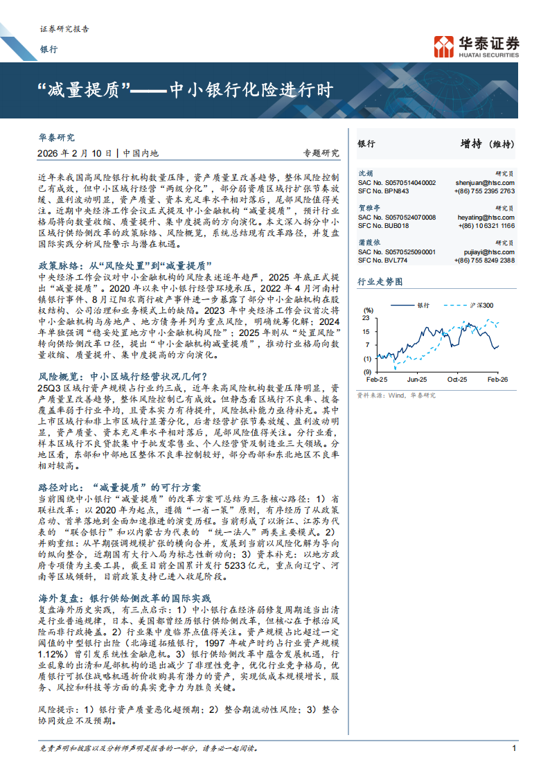 中央经济工作会议对中小金融机构的风险表述逐年趋严,近期正式提出“减量提质”。2020年以来中小银行经营环境承压,2022年4月河南村镇银行事件、8月辽阳农商行破产事件进一步暴露了部分中小金融机构在股权结构、公司治理和业务模式上的缺陷。2023年中央经济工作会议首次将中小金融机构与房地产、地方债务并列为重点风险,明确统筹化解;2024年单独强调“稳妥处置地方中小金融机构风险”;2025年则从“处置风险”转向供给侧改革口径,提出“中小金融机构减量提质”,推动行业格局向数量收缩、质量提升、集中度提高的方向演化。