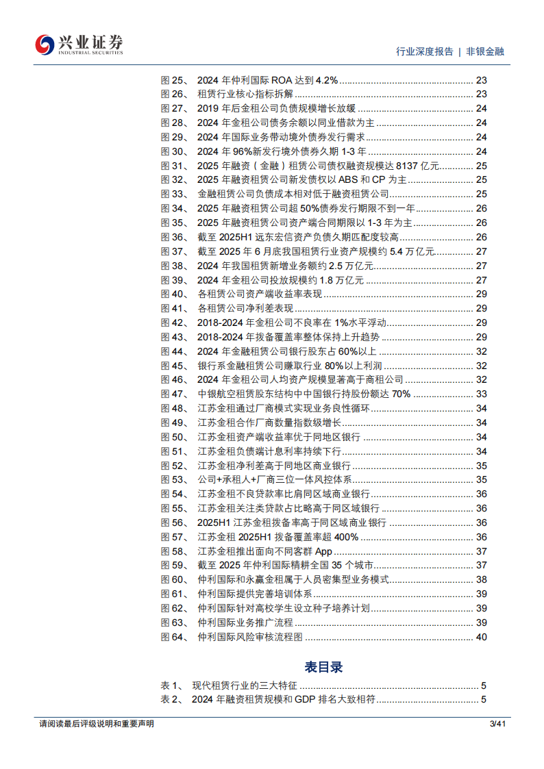 选择的普适性规律。股东背景是决定不同租赁公司禀赋进而影响经营策略的核心因素。根据股东背景,可以将租赁行业进一步细分为银行系/产业系/平台系/三方系。股东实力对应融资能力、资产优势等区别将传导至经营策略选择,可以将租赁公司的经营策略大致分为三条路径。1)具有强大股东背景的公司根据母公司禀赋选择经营方向。包括负债端成本相对较低的大型银行系金租公司、凭借母公司资产端产业/地域优势深入细分赛道经营的产业系和平台系公司。中小银行系金租公司和第三方租赁公司负债端成本相对较高,但市场化程度高,共同点在于以完善的服务体系和专业化程度吸引小微客户,实现和大型租赁公司的错位竞争。具体路径又可分为两类:2)差异化业务模式和完善服务体系提升盈利能力。主要案例为江苏金租,通过厂商租赁模式实现业务在不同细分行业的批量化复制,包括科技、风控在内的完善服务体系提升服务效率同时加强厂商粘性。3)依靠密集的人力资源累积实现业务扩张。主要案例为仲利国际、永赢金租,通过细化的区域布局和标准化作业流程,提升经营管理效率、压缩业务成本。