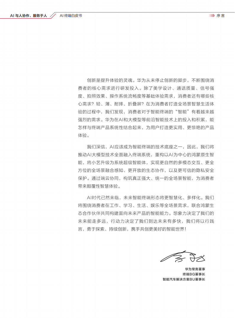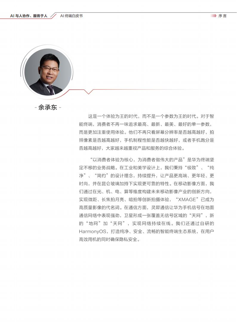 “以消费者体验为核心,为消费者做伟大的产品”是华为终端坚定不移的业务战略。在工业和美学设计上,我们秉持“极致”、“纯净”、“简约”的设计理念,持续提升,让产品更高端、更年轻、更时尚,并在昆仑玻璃加持下实现更可靠的特性。在移动影像方面,我们通过在光、机、电、算等维度构建未来移动影像产业的创新方向,实现微距、长焦拍月亮、暗拍等创新拍摄体验,“XMAGE”已成为高质量影像的代名词。在通信方面,灵犀通信让华为手机信号在地面通信网络中表现强劲,卫星形成一张覆盖无信号区域的“天网”,新的“地网”加“天网”,实现网络持续在线。我们还通过自研的HarmonyOS,打造纯净、安全、流畅的智能终端生态系统,在用户高效用机的同时确保隐私安全。创新是提升体验的灵魂。华为从未停止创新的脚步,不断围绕消费者的核心需求进行研发投入。除了美学设计、通话质量、信号强度、拍照效果、操作系统流畅度等基础体验需求,消费者还有哪些核心需求?轻、薄、耐摔、折叠屏?在为消费者打造全场景智慧生活体验的过程中,我们发现,消费者对于智能终端的“智能”有着越来越强烈的需求。华为在AI和大模型等前沿智能技术上的投入和积累,能怎样与终端产品系统性结合起来,为用户打造更实用、更惊艳的产品体验。