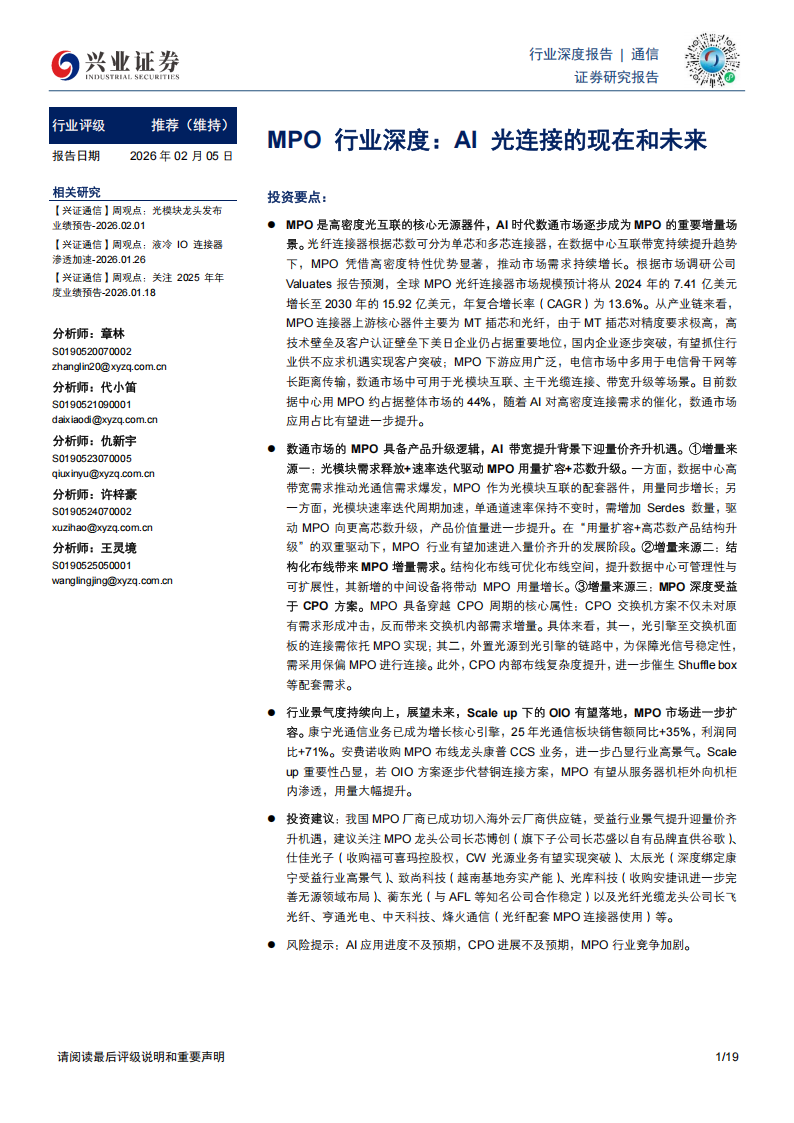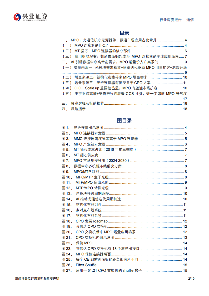 ●风险提示:AI应用进度不及预期,CPO进展不及预期,MPO行业竞争加剧。