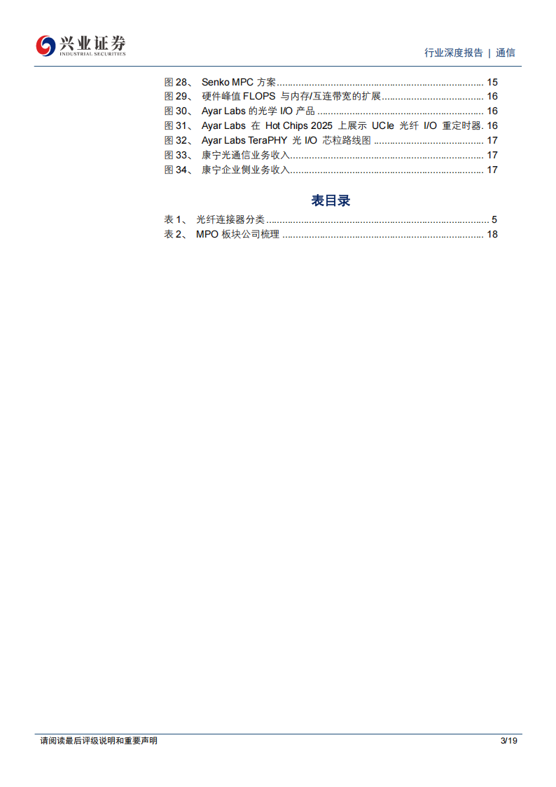 容。康宁光通信业务已成为增长核心引擎,25年光通信板块销售额同比+35%,利润同比+71%。安费诺收购MPO布线龙头康普CCS业务,进一步凸显行业高景气。Scaleup重要性凸显,若OIO方案逐步代替铜连接方案,MPO有望从服务器机柜外向机柜内渗透,用量大幅提升。