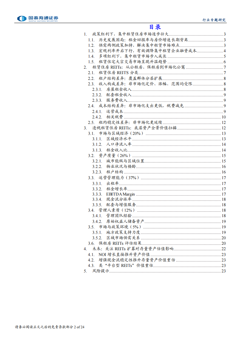 0REITs常态化扩募机制将通过规模效应、风险分散及预期改善三重路径,推升存量资产估值水平。借鉴国际经验与上市公司并购逻辑,未来租赁住房类REITs扩募不仅是规模增长,更是价值重塑。首先,扩募带来的规模效应能摊薄固定管理成本,直接提升净运营收入(NOI)利润率,进而提高DCF估值;其次,通过区域互补和租户结构差异化资产注入,能有效降低单一资产空置风险,增强现金流稳定性,从而降低资本化率(Cap Rate);最后,具备持续扩募能力的“平台型REITs”将获得市场更高营运资金乘数(P/FFO)溢价,实现整体估值中枢上移。风险提示:模型与数据的局限性风险、资产特定与集中度风险、政策变动与执行风险、原始权益人扩募能力的确定性风险。