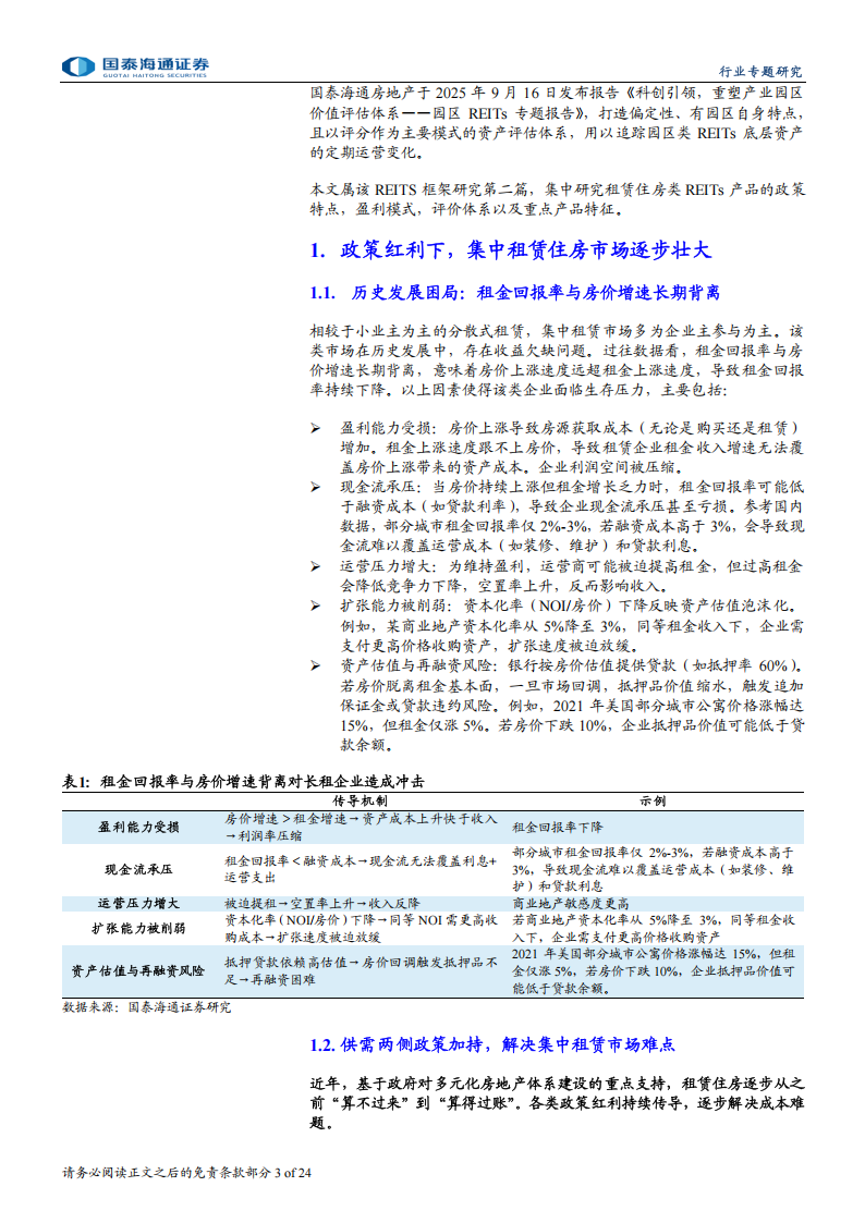 O国泰海通房地产于2025年9月16日发布报告《科创引领,重塑产业园区价值评估体系——园区REITs专题报告》,打造偏定性、有园区自身特点,且以评分作为主要模式的资产评估体系,用以追踪园区类REITs底层资产的定期运营变化。本文属该REITS框架研究第二篇,集中研究租赁住房类REITs产品的政策特点,盈利模式,评价体系以及重点产品特征。