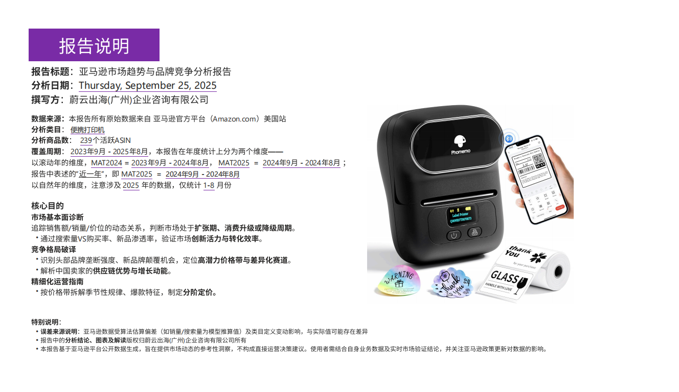 市场健康度诊断:通过销售额与销量的同比变化,判断亚马逊该品类的整体增长态势(如增长乏力,稳定扩张。或爆发式增长)。若销售额增速持续远亮于销量,表明消费者倾向于高价商品或通胀影响显著;若销量增速高于销售额,则可能反映低价竞争加剧或消费降级趋势。价位变化提供定价环境背景。季节性规律挖掘:识别该品类固有的消费周期(如Q4旺季因黑五/圣诞激增、Q1回落、年中Prime Day效应等),揭示销售规律性波动。为库存管理、促销规划(预热、高峰、清仓)和现金流预测提供关键依据,优化运营节奏。价格与需求关系洞察:观察市场平均价位与销售规模随时间的动态关联,验证价格敏感度——价位的显著变化(如持续上张或下降)是伴随销售量的反向剧波动?探究均价上张是被销量支撑的市场扩张,还是高价值商品驱动的结构性变化宏观需求趋势研判:分析年度搜素总量(代表市场整体需求热度)的长期(5年)变化轨迹,判断该品类消费者的线上需求是长期稳定增长.爆发式上升、趋于饱和还是缓慢下滑。招供市场基本面判断依据。营销节奏精细校准:识别月度级别的搜索高峰和低谷(超越年度均值),揭示精准的消费者主动需求时间窗。指导全年关键营销活动(新品发布、品牌推广、付费广告投放)的时间点安排,确保高曝光与高需求时段匹配,最大化营销效率。需求转化效率追踪:比较消费者搜索行为(需求量)与实际购买行为(购买率)的演化关系,若某年购买率相对搜索量显著上升,说明平台流量利用效率提升或消费者决策链路缩短(可能商品信息优化、评论引导提升信任、物流速度改善等)。反之则提示可能存在页面转化障碍或商品匹配度下降问题。用户真实需求解码:聚集最亮频的10个搜索词,剖析其对应的商品特征或使用场景。高搜索量代表广泛关注度;高购买率则表明需求与实际提供的商品或服务高度契合。综合分析可揭示该品类消费者的核心痛点。关注点(如人群、材质、功能、场景)和购买驱动因素,指导产品开发、关键词优化和Listing优化。市场活力与竞争生态评估:分析当前在售商品主要由哪些年份上架的商品构成。若新品牌新品(近1-2年上架)占比较亮,表明市场活力强.创新频繁、新品有机会;若老品(2年+)占主导,则市场格局可能固化,新进入者面临壁垒或用户对经典产品忠诚度高。卖家地域竞争力对比:分析不同国家(尤其是中国卖家)卖家的当前销售份额及年度增长/廉退趋势。判断主要竞争来源地的实力变迁(如中国卖家市场份额增长对本地卖家冲击)。新进入者潜力与格局河察(中国卖家聚焦);交叉分析卖家国家与商品新旧程度(上架年份),特关注中国卖家新品(如近1年上架)的数量占比和增长趋势,判断其在市场中的渗透力、增长势头和未来潜力。同时现察其他国家新旧结构,对比中国卖家的竞争策略(如主攻新品还是运营老品)。