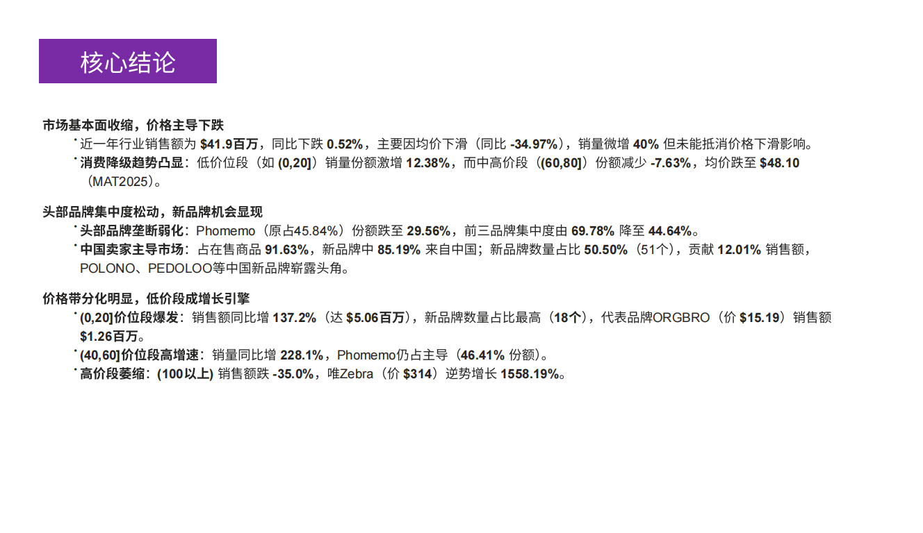 ·高价段萎缩:(100以上)销售额跌-35.0%,唯Zebra(价$314)逆势增长1558.19%。