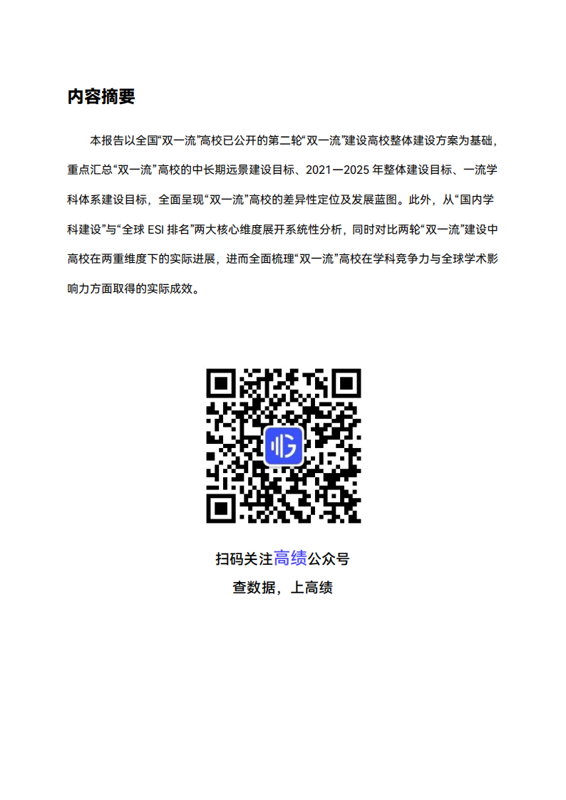 本报告以全国“双一流”高校已公开的第二轮“双一流”建设高校整体建设方案为基础,重点汇总“双一流”高校的中长期远景建设目标、2021—2025年整体建设目标、一流学科体系建设目标,全面呈现“双一流”高校的差异性定位及发展蓝图。此外,从“国内学科建设”与“全球ESI排名”两大核心维度展开系统性分析,同时对比两轮“双一流”建设中高校在两重维度下的实际进展,进而全面梳理“双一流”高校在学科竞争力与全球学术影响力方面取得的实际成效。
