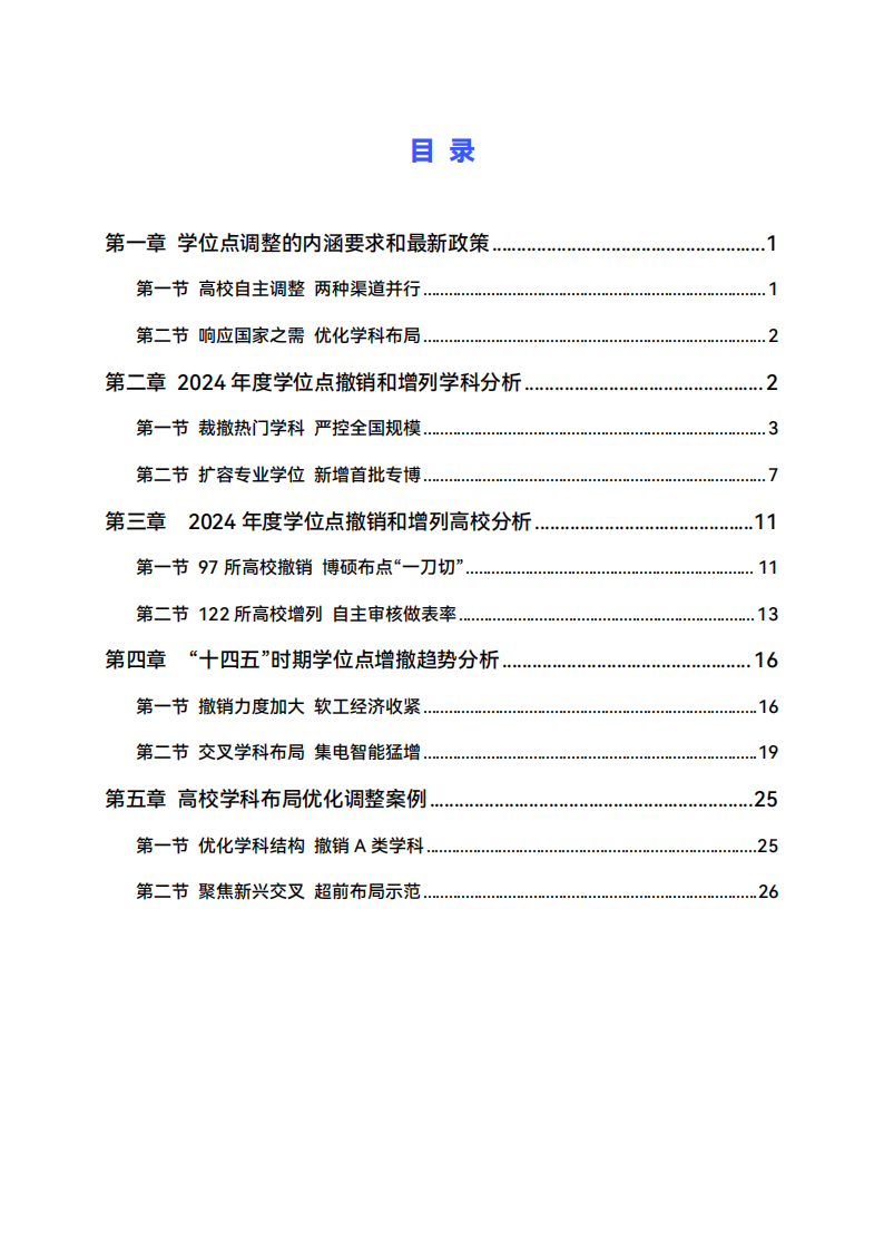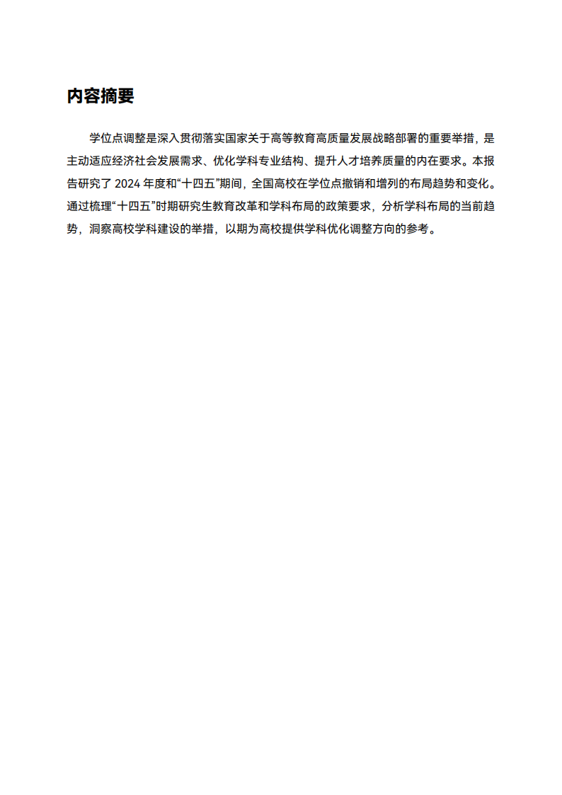 学位点调整是深入贯彻落实国家关于高等教育高质量发展战略部署的重要举措,是主动适应经济社会发展需求、优化学科专业结构、提升人才培养质量的内在要求。本报告研究了2024年度和“十四五”期间,全国高校在学位点撤销和增列的布局趋势和变化。通过梳理“十四五”时期研究生教育改革和学科布局的政策要求,分析学科布局的当前趋势,洞察高校学科建设的举措,以期为高校提供学科优化调整方向的参考。