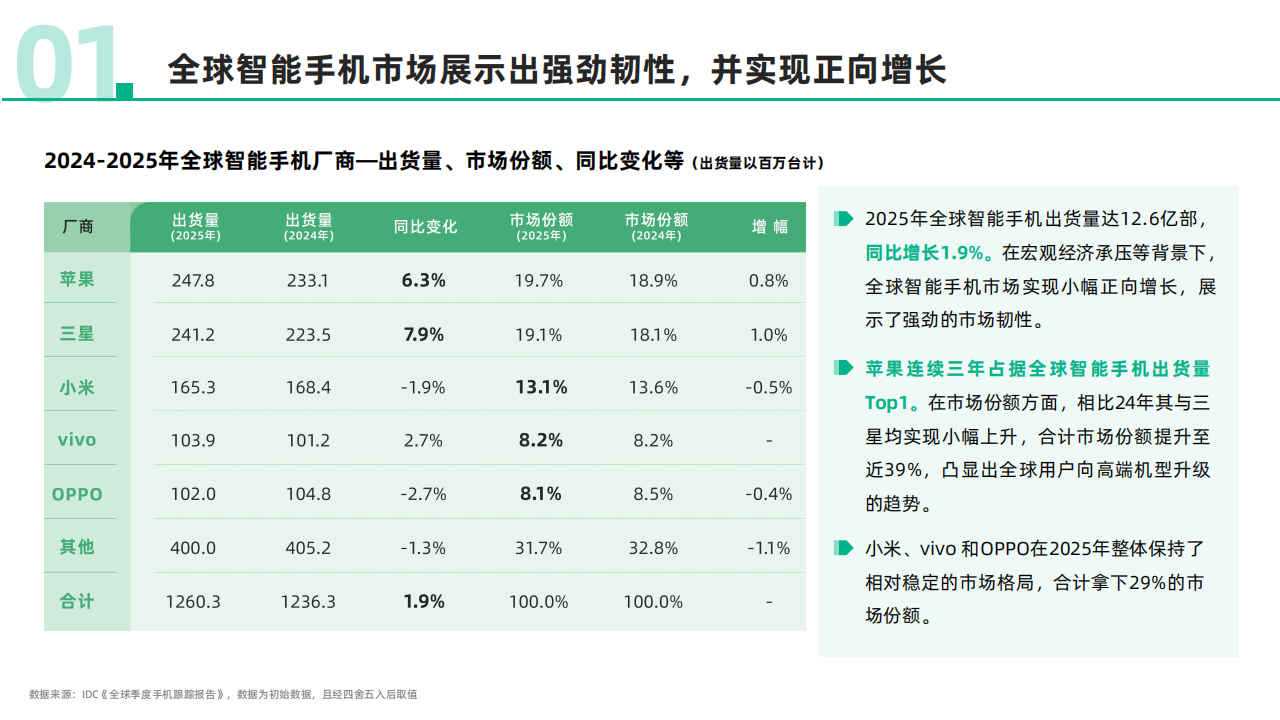 2025年全球智能手机出货量达12.6亿部,同比增长1.9%。在宏观经济承压等背景下,全球智能手机市场实现小幅正向增长,展示了强劲的市场韧性。