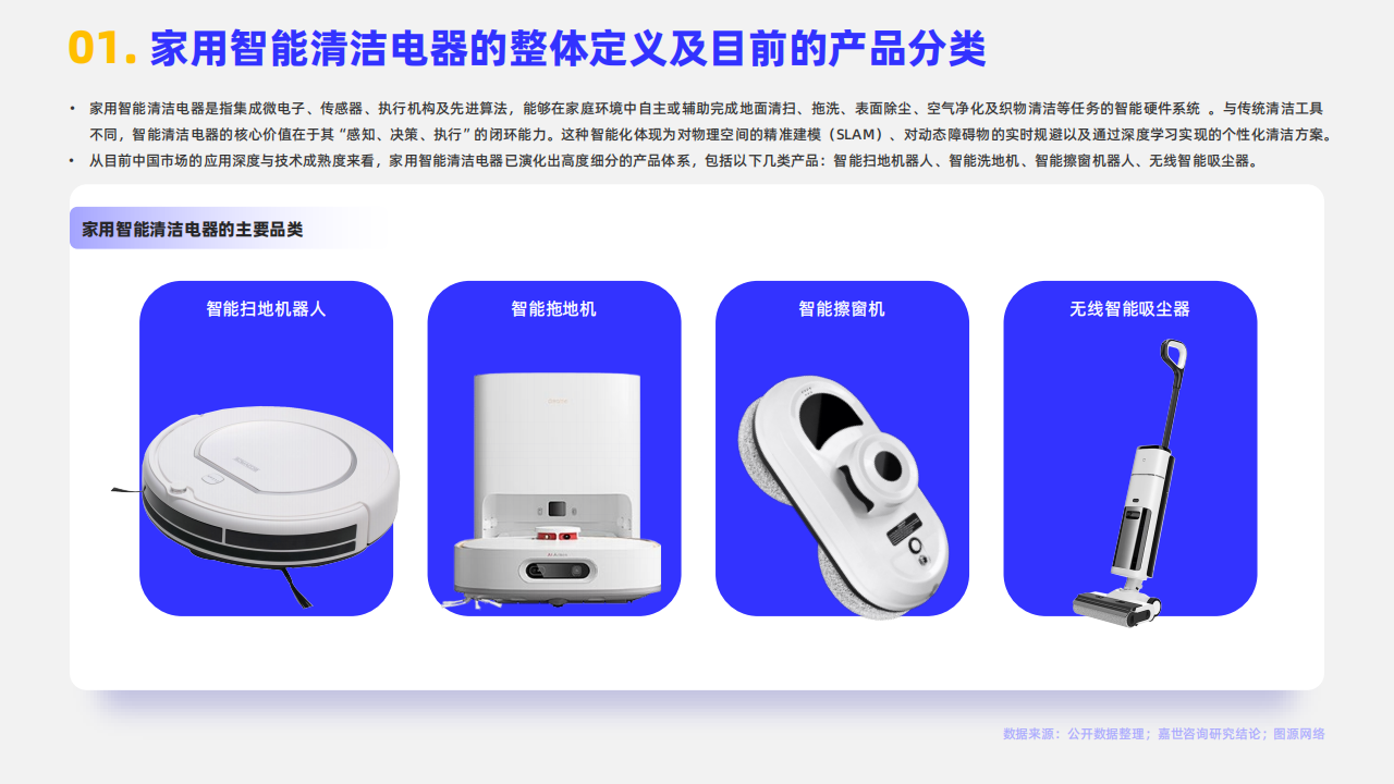 客户智能清洁电器是集成微电子、传感器、执行机构及先进技术,能够在家庭环境中自主或借助完成前面清扫、拖洗、表涂灰尘、空气净化及织物清洁等任务的智能硬件系统,与传统清洁工具不同,智能清洁电器的核心价值在于其感知、决策、执行的闭环能力。这种智能化体现为对物理空间的精准建模(SLAM)、对动态障碍物的实时规避以及通过深度学习实现的个性化解决方案。从目前中国市场的应用度和技术成熟度来看,家用智能清洁电器已派出高精度的部分产品,包括以下几类产品:智能扫地机器人、智能洗地机、智能擦除机人、无线智能吸器。