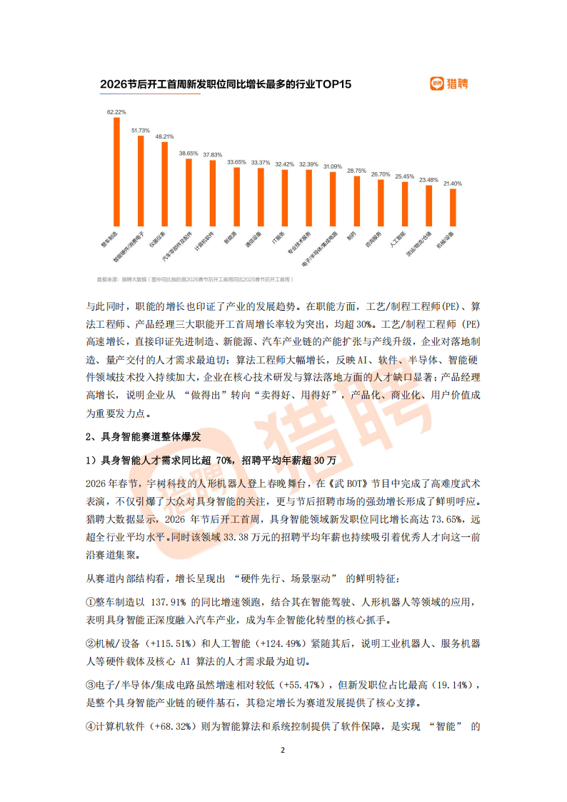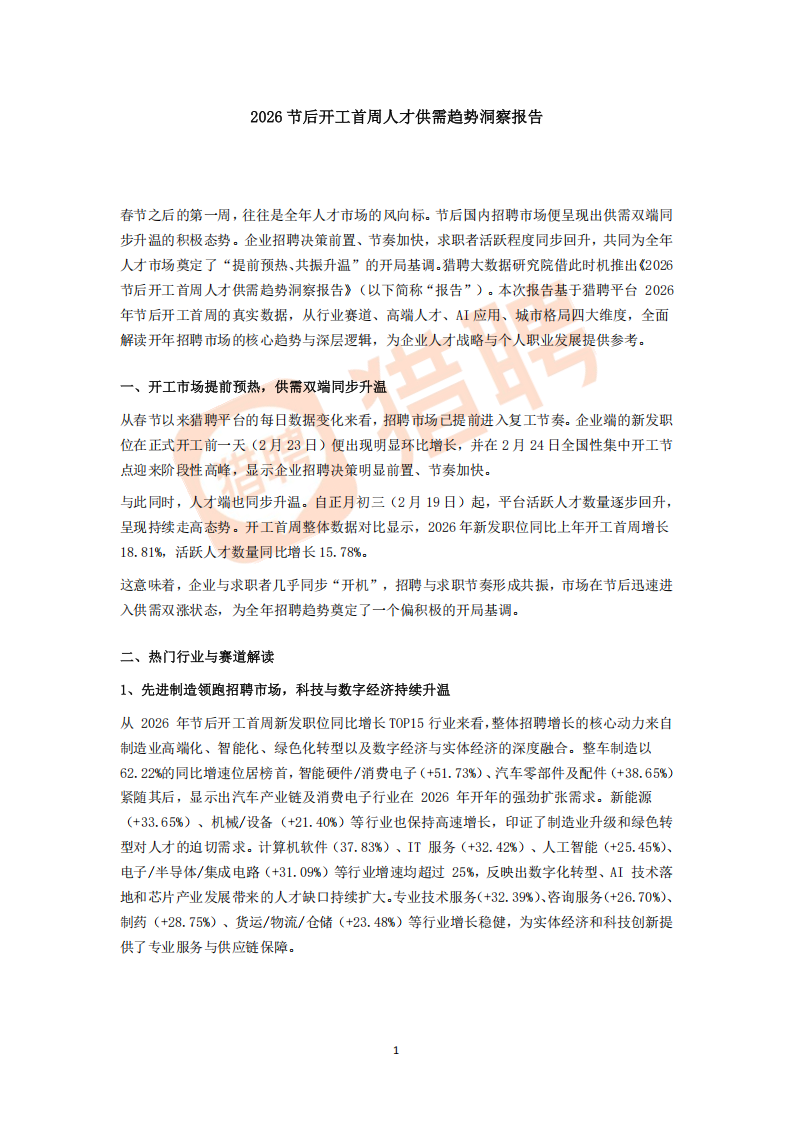 春节之后的第一周,往往是全年人才市场的风向标。节后国内招聘市场便呈现出供需双端同步升温的积极态势。企业招聘决策前置、节奏加快,求职者活跃程度同步回升,共同为全年人才市场奠定了“提前预热、共振升温”的开局基调。猎聘大数据研究院借此时机推出《2026节后开工首周人才供需趋势洞察报告》(以下简称“报告”)。本次报告基于猎聘平台2026年节后开工首周的真实数据,从行业赛道、高端人才、AI应用、城市格局四大维度,全面解读开年招聘市场的核心趋势与深层逻辑,为企业人才战略与个人职业发展提供参考。