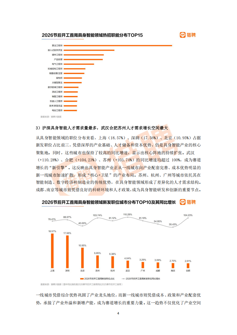 ③电子/半导体/集成电路虽然增速相对较低(+55.47%),但新发职位占比最高(19.14%),是整个具身智能产业链的硬件基石,其稳定增长为赛道发展提供了核心支撑。