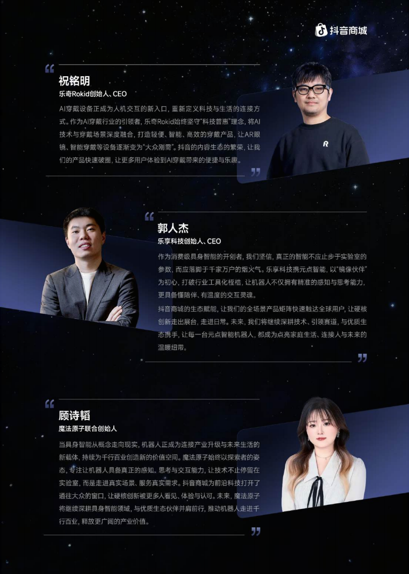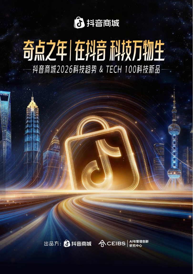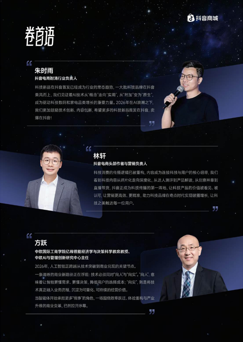 科技新品在抖音首发已经成为行业的常态趋势,一大批科技品牌在抖音乘风而上,我们见证着Al技术从概念”走向“实用”,从“附加”变为“原生”,成为驱动科技数码和家电品类增长的重要力量。2026年在Al浪潮之下,我们更加鼓励技术创新、内容创新,希望更多的科技新品首发在抖音,卖爆在抖音!