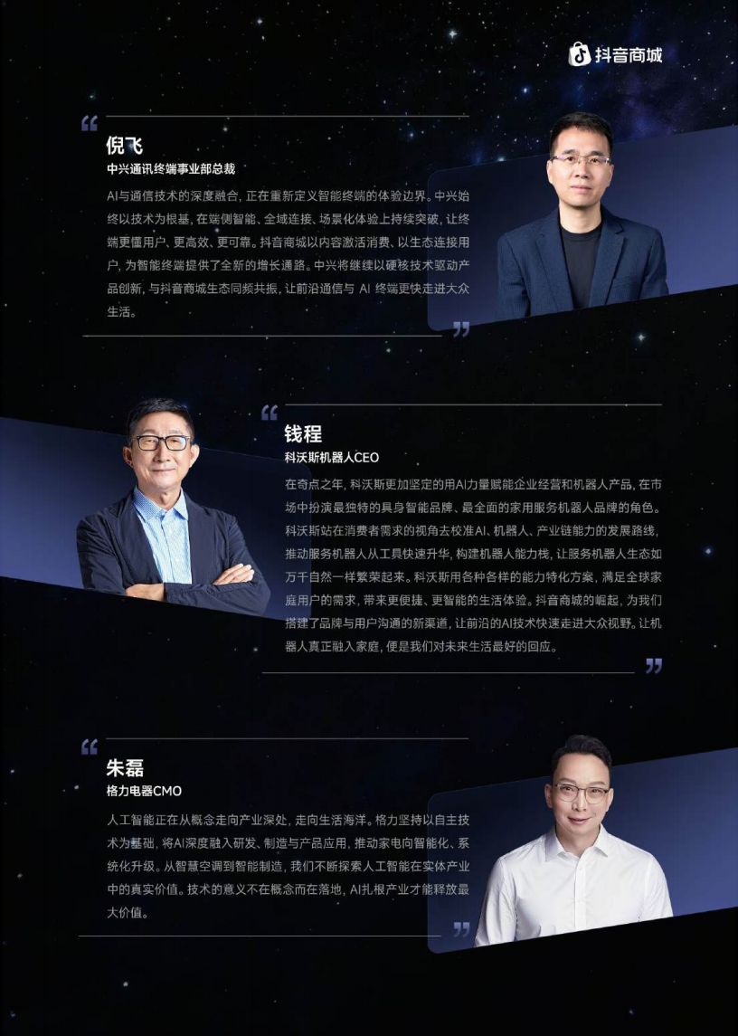 Al与通信技术的深度融合,正在重新定义智能终端的体验边界。中兴始终以技术为根基,在端侧智能、全域连接、场景化体验上持续突破,让终端更懂用户、更高效、更可靠。抖音商城以内容激活消费、以生态连接用户,为智能终端提供了全新的增长通路。中兴将继续以硬核技术驱动产品创新,与抖音商城生态同频共振,让前沿通信与AI终端更快走进大众生活。