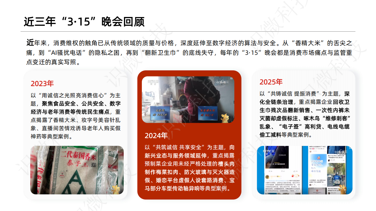 近年来,消费维权的触角已从传统领域的质量与价格,深度延伸至数字经济的算法与安全。从“香精大米”的舌尖之痛,到“AI骚扰电话”的隐私之困,再到“翻新卫生巾”的底线失守,每年的“3·15”晚会都是消费市场痛点与监管重点变迁的真实写真。