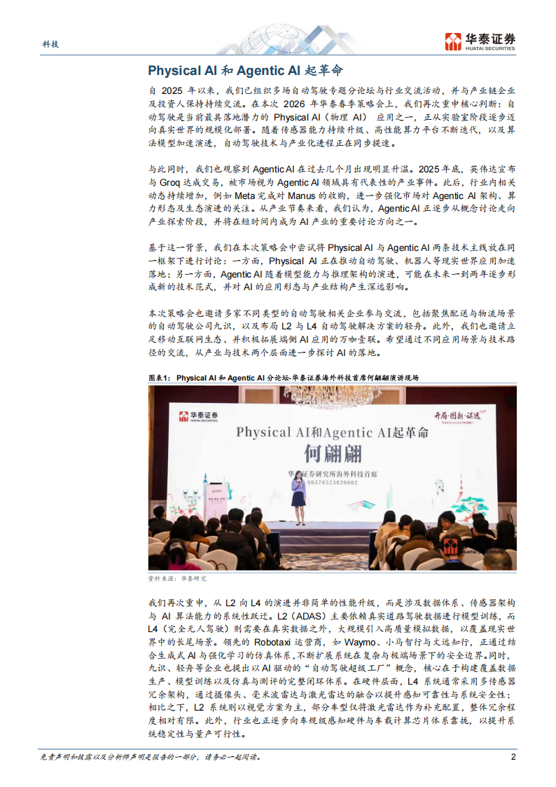 自2025年以来,我们已组织多场自动驾驶专题分论坛与行业交流活动,并与产业链企业及投资人保持持续交流。在本次2026年华泰春季策略会上,我们再次重申核心判断:自动驾驶是当前最具落地潜力的Physical AI(物理AI)应用之一,正从实验室阶段逐步迈向真实世界的规模化部署。随着传感器能力持续升级、高性能算力平台不断迭代,以及算法模型加速演进,自动驾驶技术与产业化进程正在同步提速。
