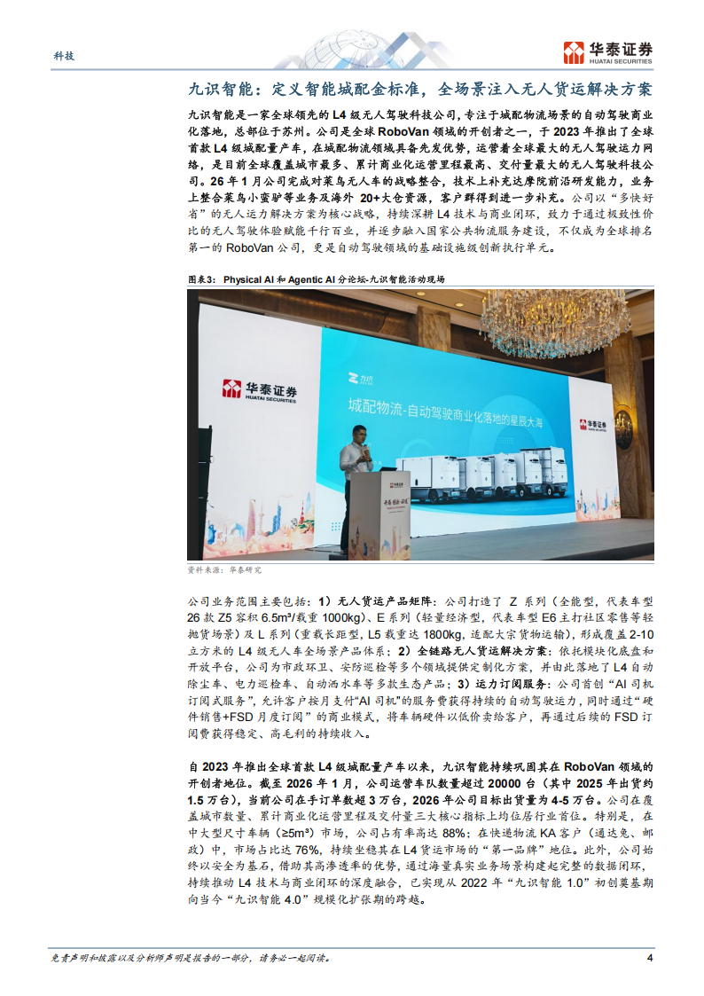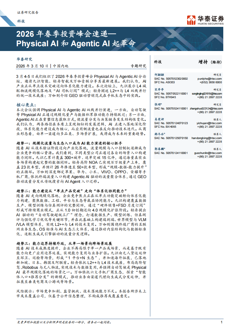 3月4-5日我们组织了2026年春季投资峰会PhysicalAI与AgenticAI分论坛,邀请九识智能、轻舟智航及万咖壹联分享其最新进展。我们认为,AI产业正从单点技术突破迈向体系化能力建设。本次论坛上,九识展示L4城配物流规模化落地及“AI司机订阅”模式;轻舟阐述L2++与L4双线并行的统一技术底座;万咖则介绍GEO驱动营销范式在手机生态中的实践。