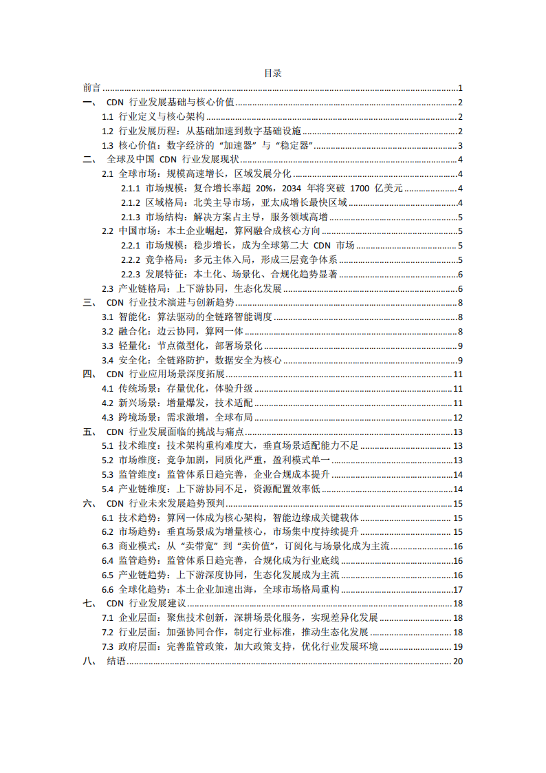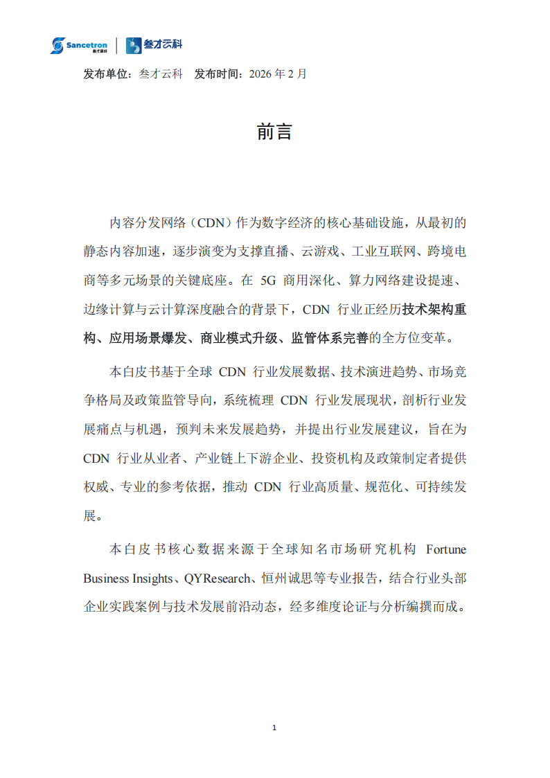 本白皮书基于全球CDN行业发展数据、技术演进趋势、市场竞争格局及政策监管导向,系统梳理CDN行业发展现状,剖析行业发展痛点与机遇,预判未来发展趋势,并提出行业发展建议,旨在为CDN行业从业者、产业链上下游企业、投资机构及政策制定者提供权威、专业的参考依据,推动CDN行业高质量、规范化、可持续发展。