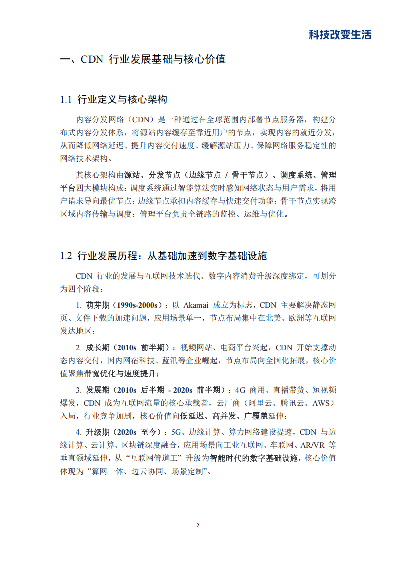 4.升级期(2020s至今):5G、边缘计算、算力网络建设提速,CDN与边缘计算、云计算、区块链深度融合,应用场景向工业互联网、车联网、AR/VR等垂直领域延伸,从“互联网管道工”升级为智能时代的数字基础设施,核心价值体现为“算网一体、边云协同、场景定制”。