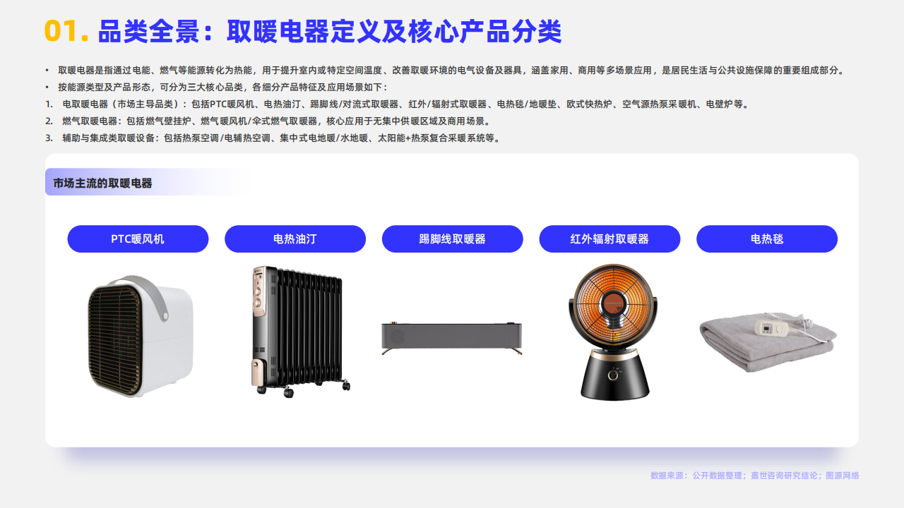 电容取暖器(市场主导品类):包括PTC暖风机、电热汀、脚划线/对流式取暖器、红外/辐射式取暖器、电冰箱/地磁室、欧式快热炉、空气源加热器、电饭炉等