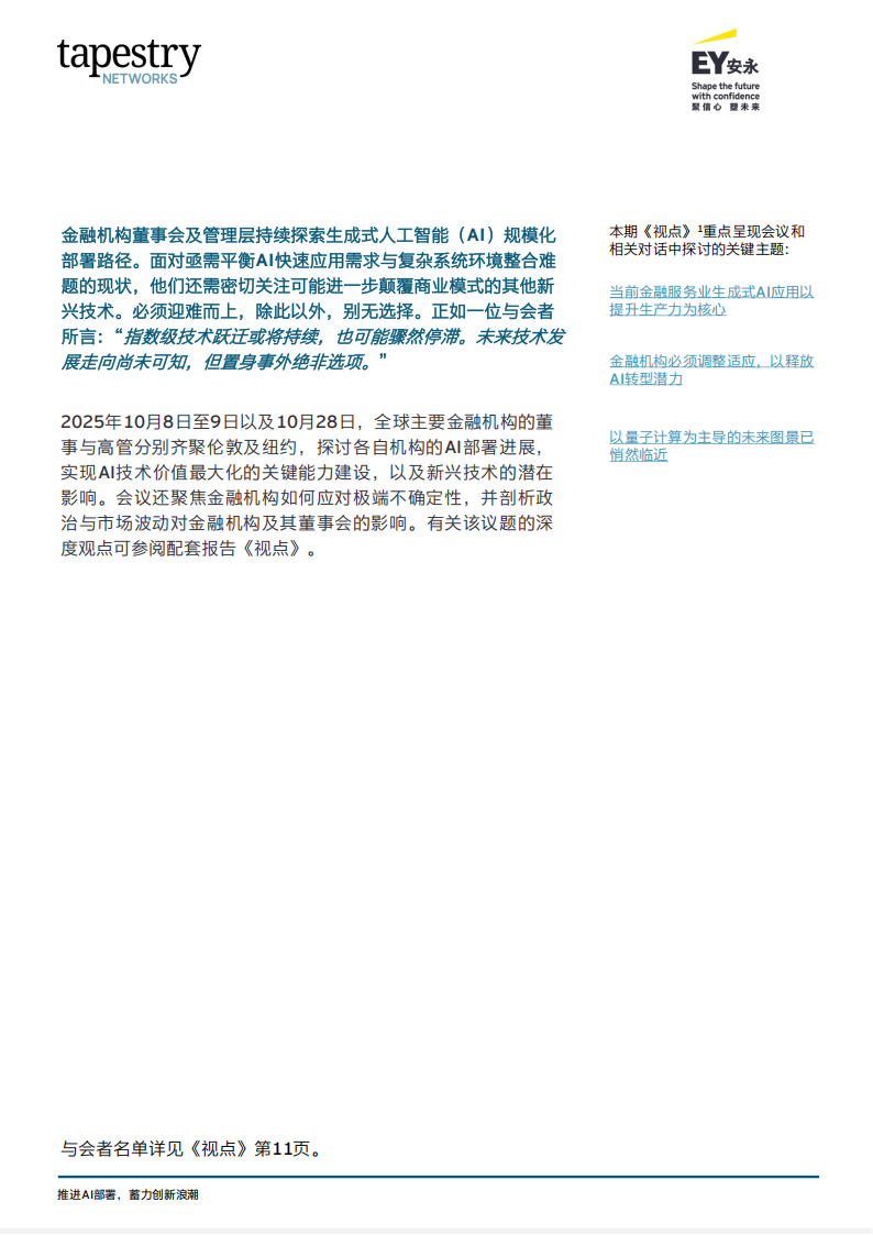 2025年10月8日至9日以及10月28日,全球主要金融机构的董事与高管分别齐聚伦敦及纽约,探讨各自机构的AI部署进展,实现Al技术价值最大化的关键能力建设,以及新兴技术的潜在影响。会议还聚焦金融机构如何应对极端不确定性,并剖析政治与市场波动对金融机构及其董事会的影响。有关该议题的深度观点可参阅配套报告《视点》。