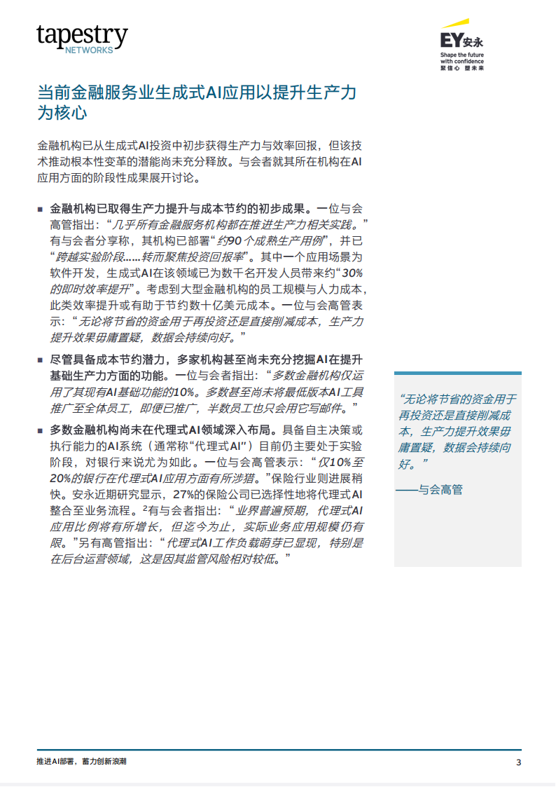 ■ 多数金融机构尚未在代理式AI领域深入布局。具备自主决策或执行能力的Al系统(通常称“代理式AI”)目前仍主要处于实验阶段,对银行来说尤为如此。一位与会高管表示:“仅10%至20%的银行在代理式AI应用方面有所涉猎。”保险行业则进展稍快。安永近期研究显示,27%的保险公司已选择性地将代理式Al整合至业务流程。2有与会者指出:“业界普遍预期,代理式AI应用比例将有所增长,但迄今为止,实际业务应用规模仍有限。”另有高管指出:“代理式AI工作负载萌芽已显现,特别是在后台运营领域,这是因其监管风险相对较低。”尽管生成式AI应用已带来生产力与运营效率双提升,但金融机构尚未实现全面转型。在监管严格、架构复杂的机构中规模化部署AI需要投入大量时间、精力和资金。一位与会董事表示:“影响将是巨大的,人们低估了达成目标的难度。”另一位与会者提醒道:“我们尚处起步阶段。虽投入大量资金用于技术许可和培训,但仍处于山麓攀登期,任重道远。”
