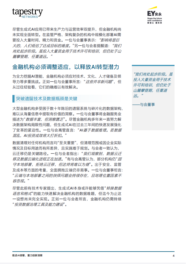 为全力挖掘AI潜能,金融机构必须应对技术、文化、人才储备及领导力等多重挑战。正如一位与会董事所言:“这些并非新问题’,但从过往经验看,它们的确难以有效解决。