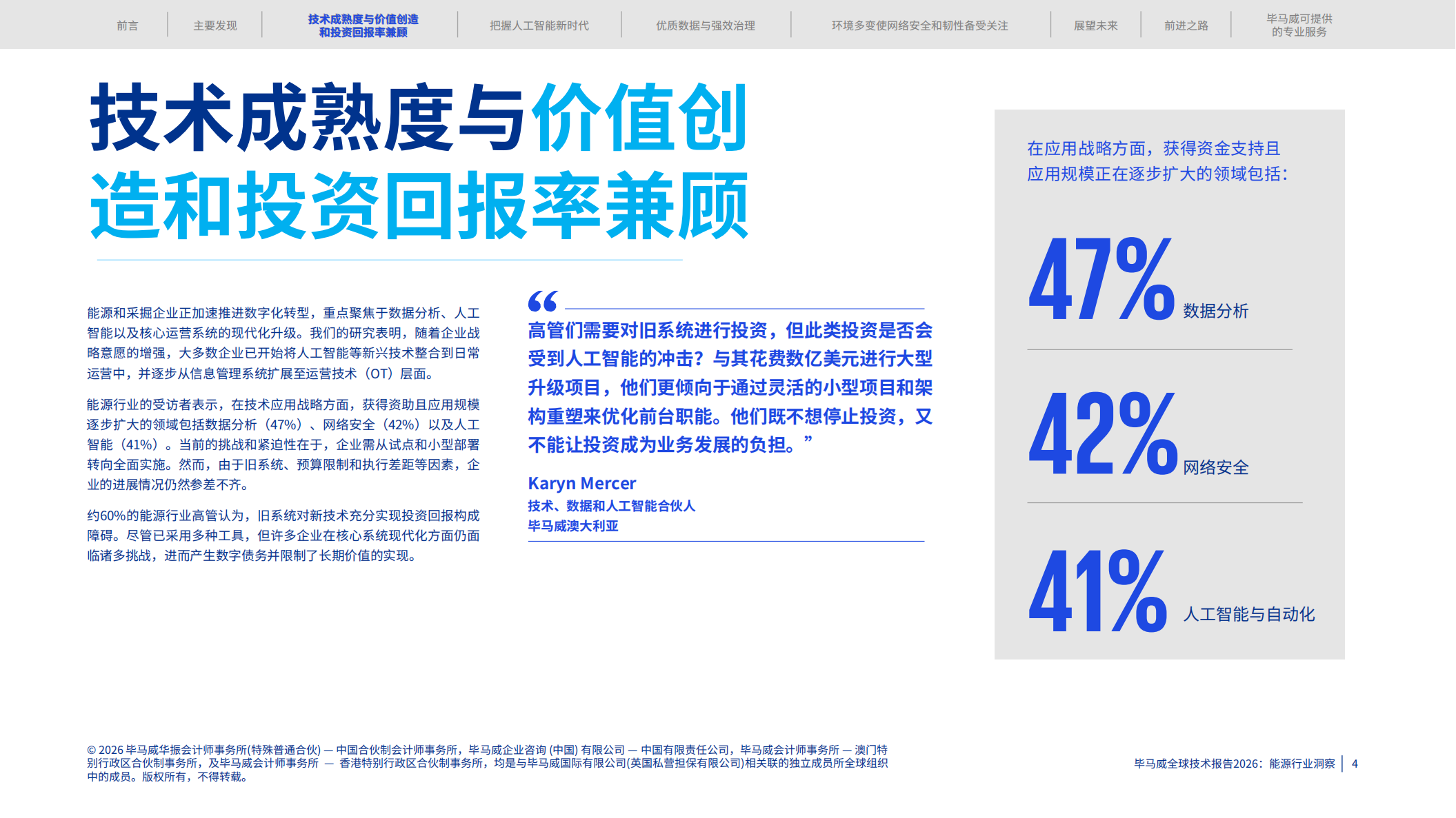 能源行业的受访者表示,在技术应用战路方面,获得资助且应用规模逐步扩大的领域包括数据分析(47%6)、网络安全(4296)以及人工智能(41%)。当前的挑战和紧迫性在于,企业需从试点和小型部署转向全面实施。然而,由于旧系统、预算限制和执行差距等因素,企业的进展情况仍然参差不齐。