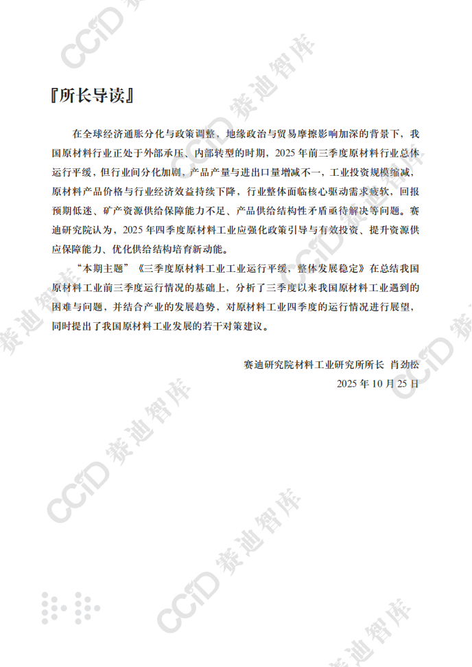 在全球经济通胀分化与政策调整,地缘政治与贸易摩擦影响加深的背景下,我国原材料行业正处于外部承压、内部转型的时期,2025年前三季度原材料行业总体运行平缓,但行业间分化加剧,产品产量与进出口量增减不一,工业投资规模缩减,原材料产品价格与行业经济效益持续下降,行业整体面临核心驱动需求疲软,回报预期低迷、矿产资源供给保障能力不足、产品供给结构性矛盾亟待解决等问题。赛迪研究院认为,2025年四季度原材料工业应强化政策引导与有效投资、提升资源供应保障能力、优化供给结构培育新动能。