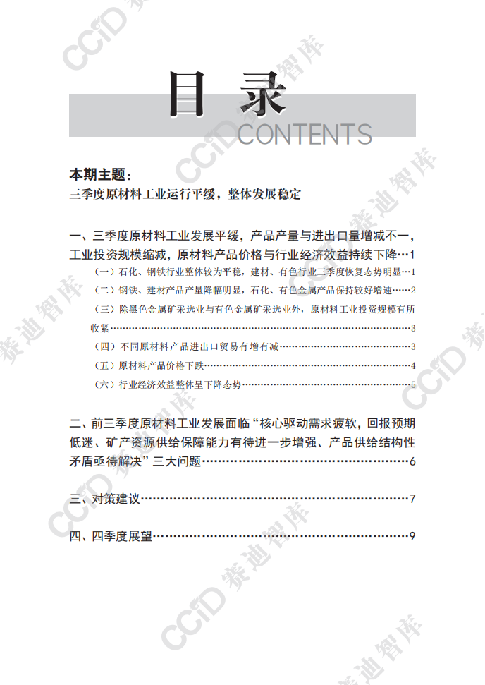“本期主题”《三季度原材料工业工业运行平缓,整体发展稳定》在总结我国原材料工业前三季度运行情况的基础上,分析了三季度以来我国原材料工业遇到的困难与问题,并结合产业的发展趋势,对原材料工业四季度的运行情况进行展望,同时提出了我国原材料工业发展的若干对策建议。