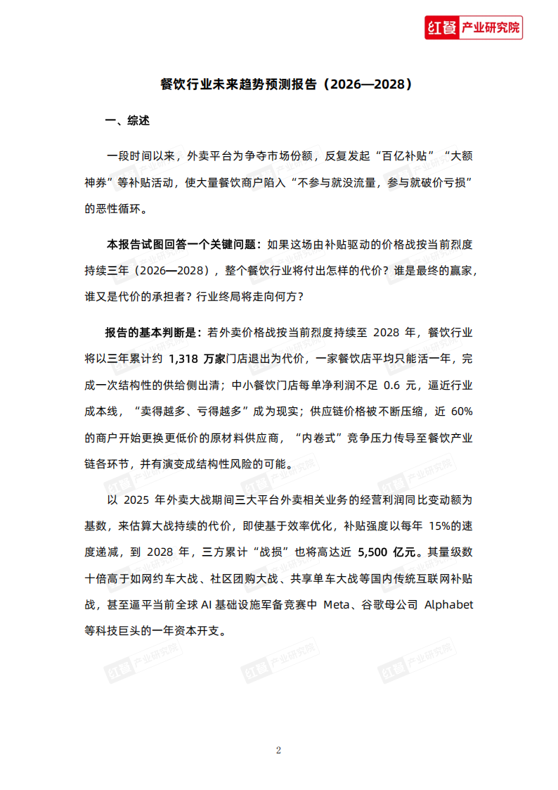 本报告试图回答一个关键问题:如果这场由补贴驱动的价格战按当前烈度持续三年(2026—2028),整个餐饮行业将付出怎样的代价?谁是最终的赢家,谁又是代价的承担者?行业终局将走向何方?