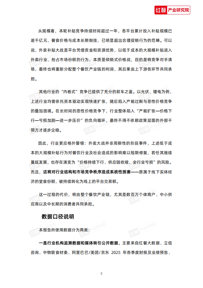 一是行业机构监测数据和媒体转引公开数据,主要来自红餐大数据、立信咨询、中物联食材委、阿里巴巴/美团/京东2025年各季度财报及业绩预告、花旗研报及媒体公开报道,用于反映门店结构、价格带变化、利润率分化及供应链压力等行业微观特征;